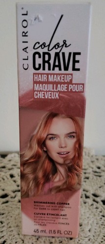 CLAIROL Brand Color Crave Hair Makeup 45mL (1.5 fl oz) Shimmering Copper Color Add a dazzling temporary color to your hair with Clairol Color Crave Hair Makeup, it instantly reflects light for a dramatic effect. Easily washes out with just shampoo. Shimmering hair makeup Easily washes out with shampoo Works on even the darkest hair Precision sponge applicator for easy styling Ammonia-and-peroxide free Damage-free formula 1.5 fl. oz hair makeup NEW SEALED in original packaging Please view photos for a good description of this item Thank you!