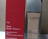 NEW IN A BOX CLARINS EVERLASTING FOUNDATION + BROADSPECTRUM SPF 15 TITANIUM DIOXIDE-SUNSCREEN SHADE: 113 CHESTNUT SIZE: 1 FL OZ / 30mL