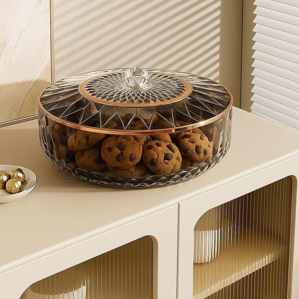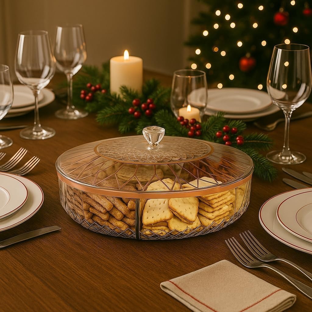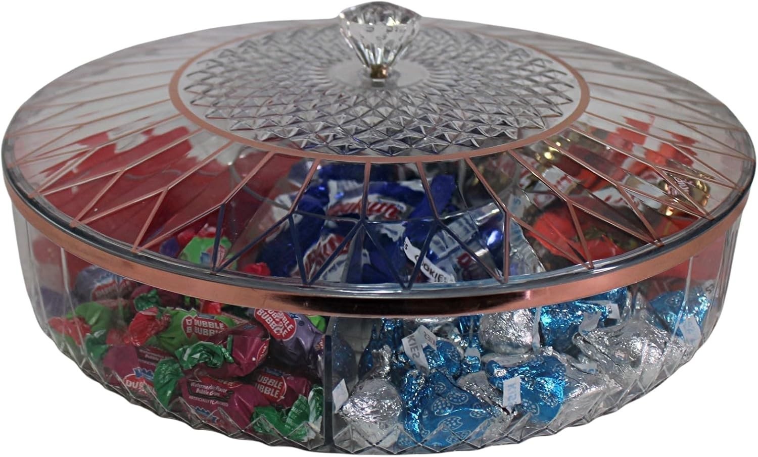 Serve and entertain with style using this elegant divided snack serving tray. Designed with rose gold accent lines and a fitted lid, this round tray is both practical and decorative. The transparent design lets guests see what?s inside, while six compartments?five outer plus one center?keep snacks neatly separated.