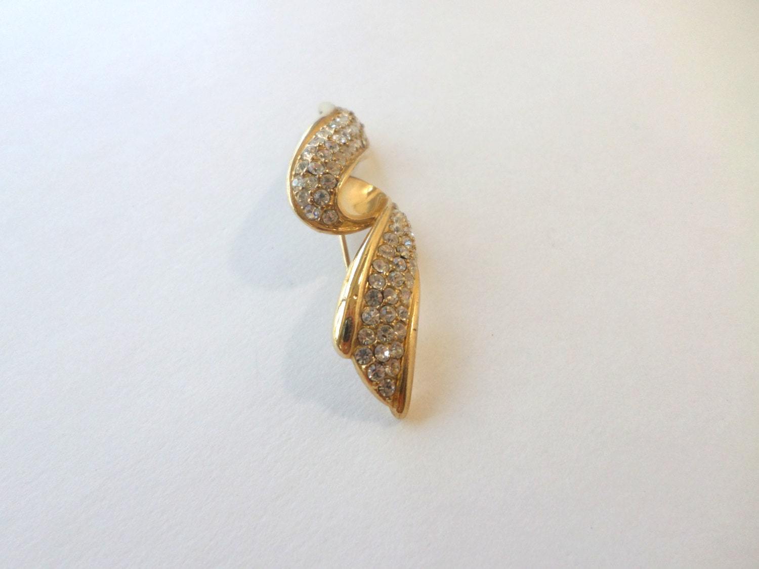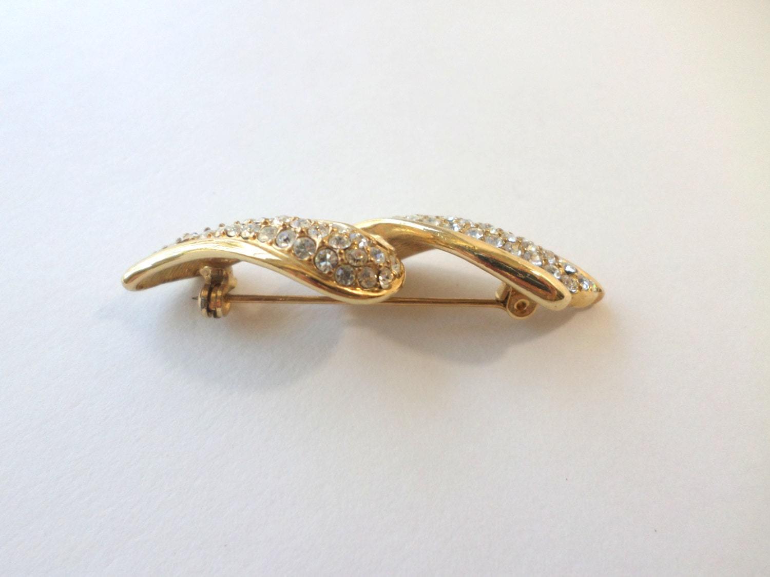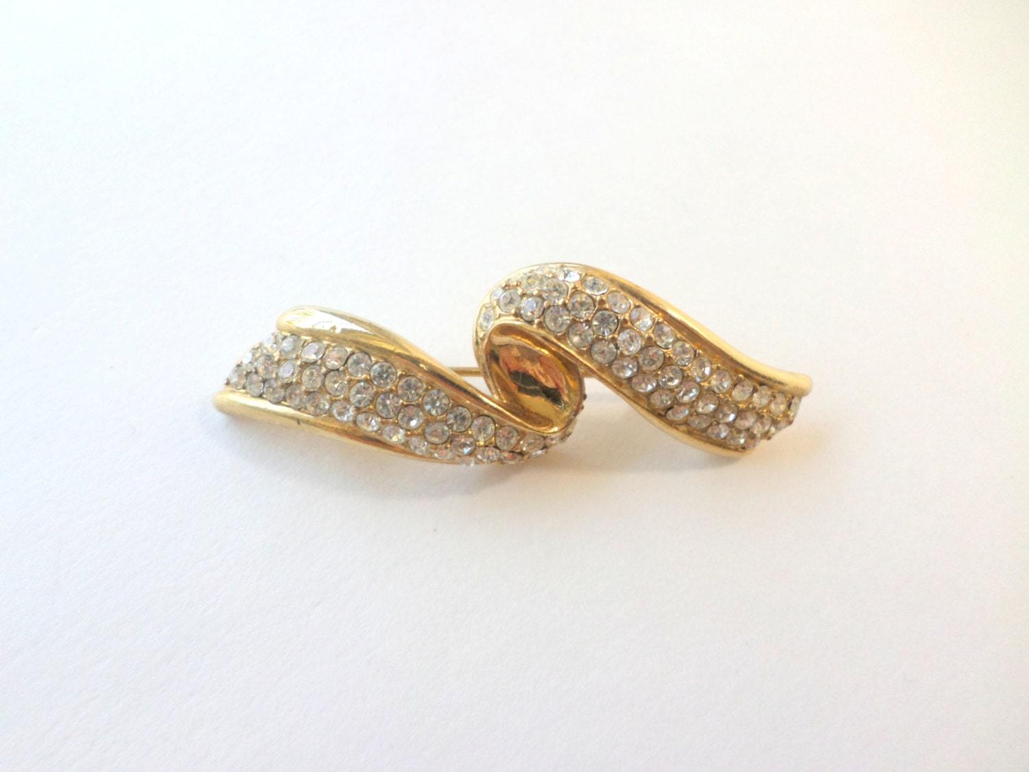 ?Style/Features: Midcentury shimmer in a dynamic ribbon motif. Two complete waves with pave set sparkling rhinestones. Classic roll clasp with straight pin. Lightweight enough for a bit thinner fabrics.