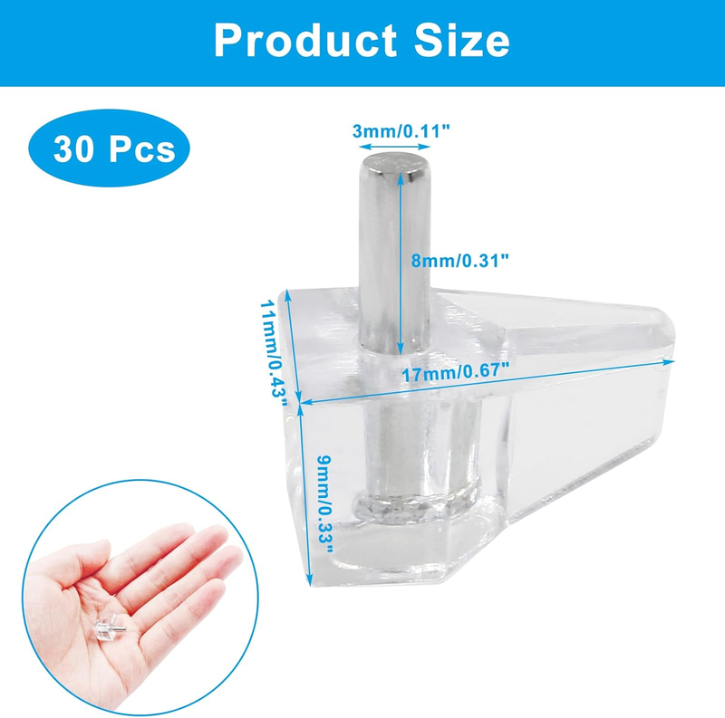 Quantity Size: This product comes in 30 pcs shelf support pins, providing a sufficient quantity for your daily use and replacement needs. Each pin has a diameter of 3mm or 1/8 inch, and a length of 0.31'' / 8mm, ensuring compatibility with various shelf hole sizes.