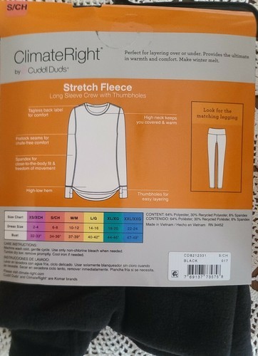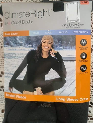 This sale is for one (1) Climate Right by Cuddl Duds Brand Shirt Size Small ~ Dress Size 6-8 ~ Bust 34"-36" Black in Color Thumbholes Flat lock seams to prevent chafing Tag-less for added comfort Brushed inside for comfort extra warmth High-low hemline Long sleeve High crew neck Base Layer ~ Cold Stretch Fleece 64% Polyester ~ 30% Recycled Polyester ~ 6% Spandex Machine wash ~ Tumble dry Top is new in original packaging Please view photos for a good description of this item Thank you!
