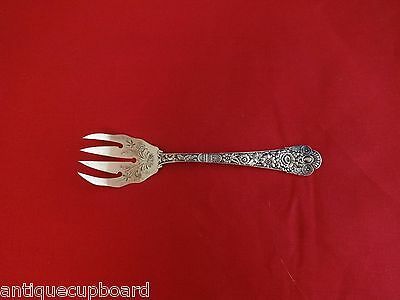 Sterling Silver SARDINE FORK 4-TINE BRIGHT-CUT WITH ENGRAVING ON SHOULDERS OF TINES 5 7/8" in the pattern CLUNY BY GORHAM. It is monogrammed (monos vary) and is in excellent condition.