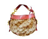 Authentic Coach Signature shoulder bag featuring brown ?C? monogram canvas with pink leather trim and gold-tone hardware. Comes with an adjustable shoulder strap and Coach hangtag. Spacious interior, perfect for everyday use.