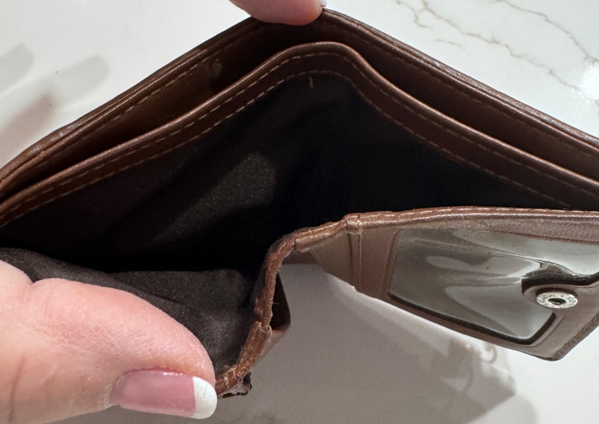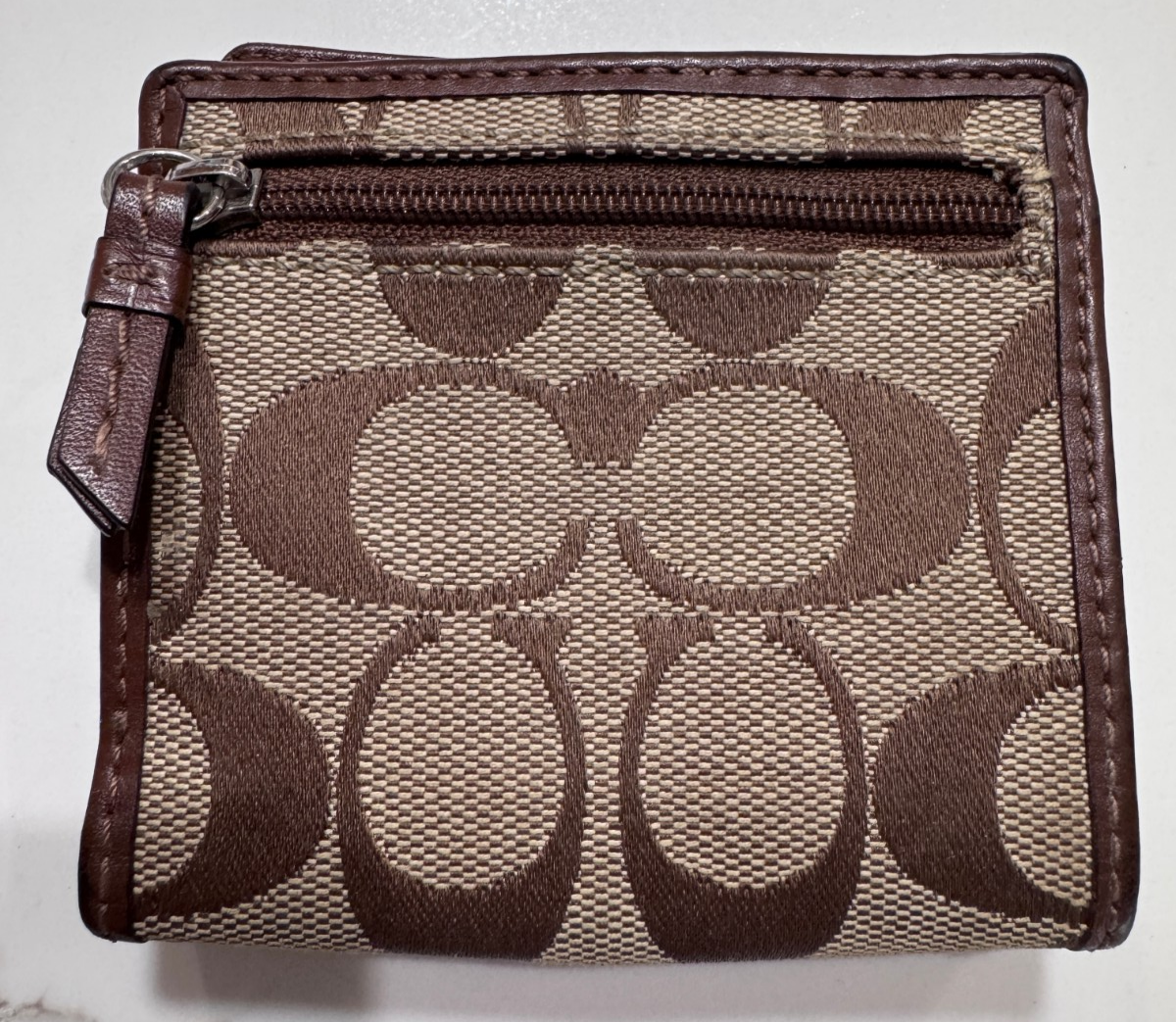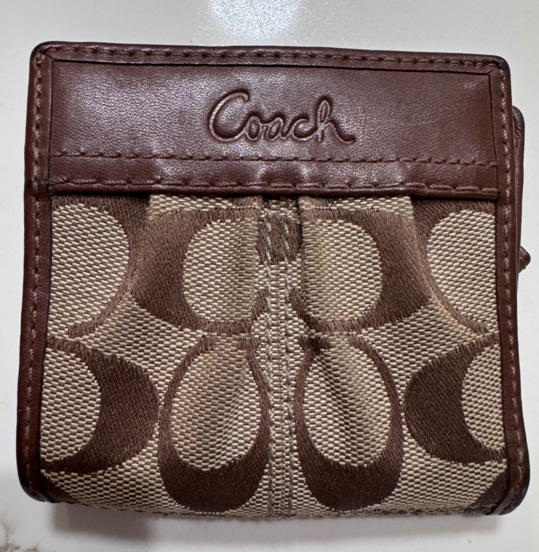 Coach Signature Cloth/Leather Monogram Billfold Wallet Measures approx 3.5 x 3.75 inches folded and 6.75 inches long when opened