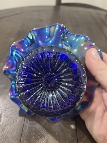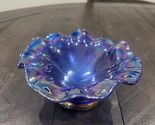 Primary image for Cobalt Blue Carnival Glass Bowl Rare Ruffled Luster 6” Signed