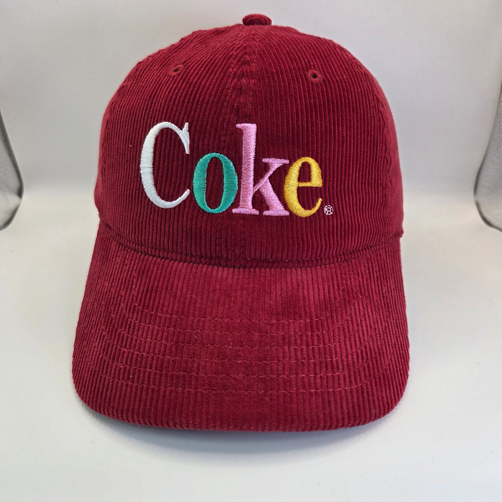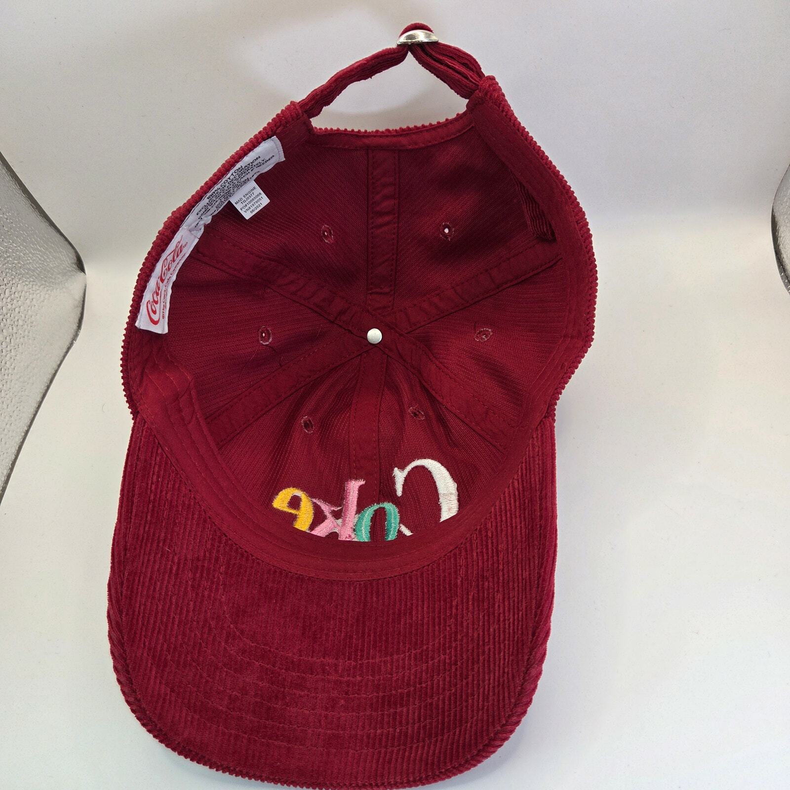 Officially licensed Coca-Cola corduroy hat in red with multicolor embroidered ?Coke? text on the front. Features an adjustable metal clasp strapback closure. Made from 100% cotton. Manufactured in June 2021. Pre-owned and in good condition with no major flaws noted. Coca-Cola licensed merchandise Red corduroy with multicolor embroidery Adjustable strapback clasp closure 100% cotton, OSFM Made in China, manufactured 06/2021 Good pre-owned condition