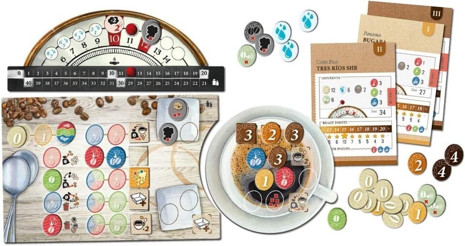Features: Fast gameplay,1 player game,Solitaire,Pool-building game,Travel game,Game for ages 14 and up,Roast level,Cup-testing,22 varieties of beans