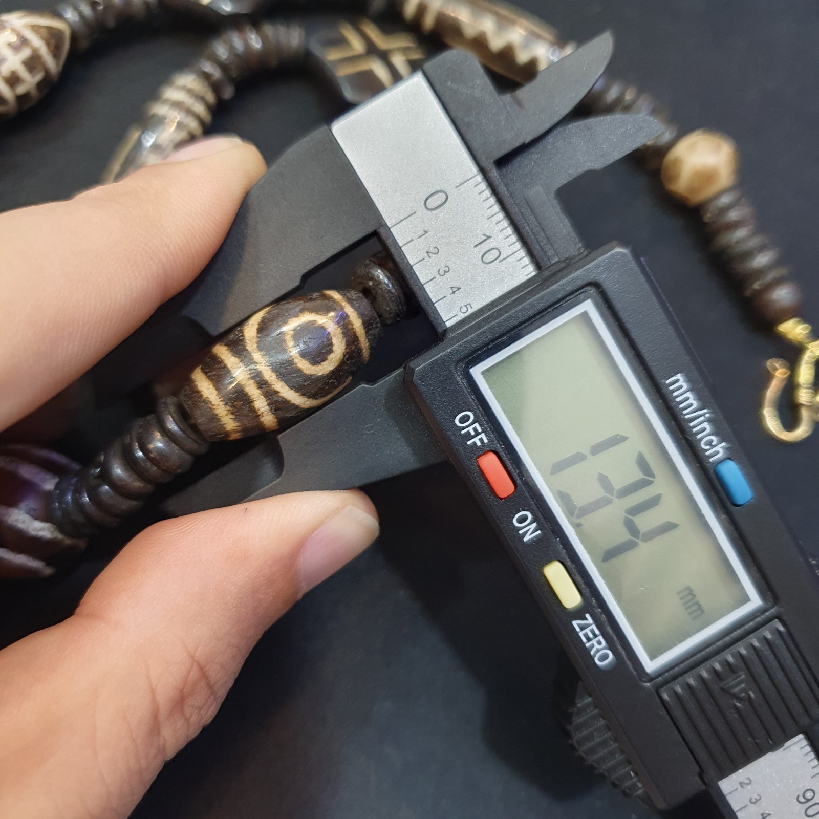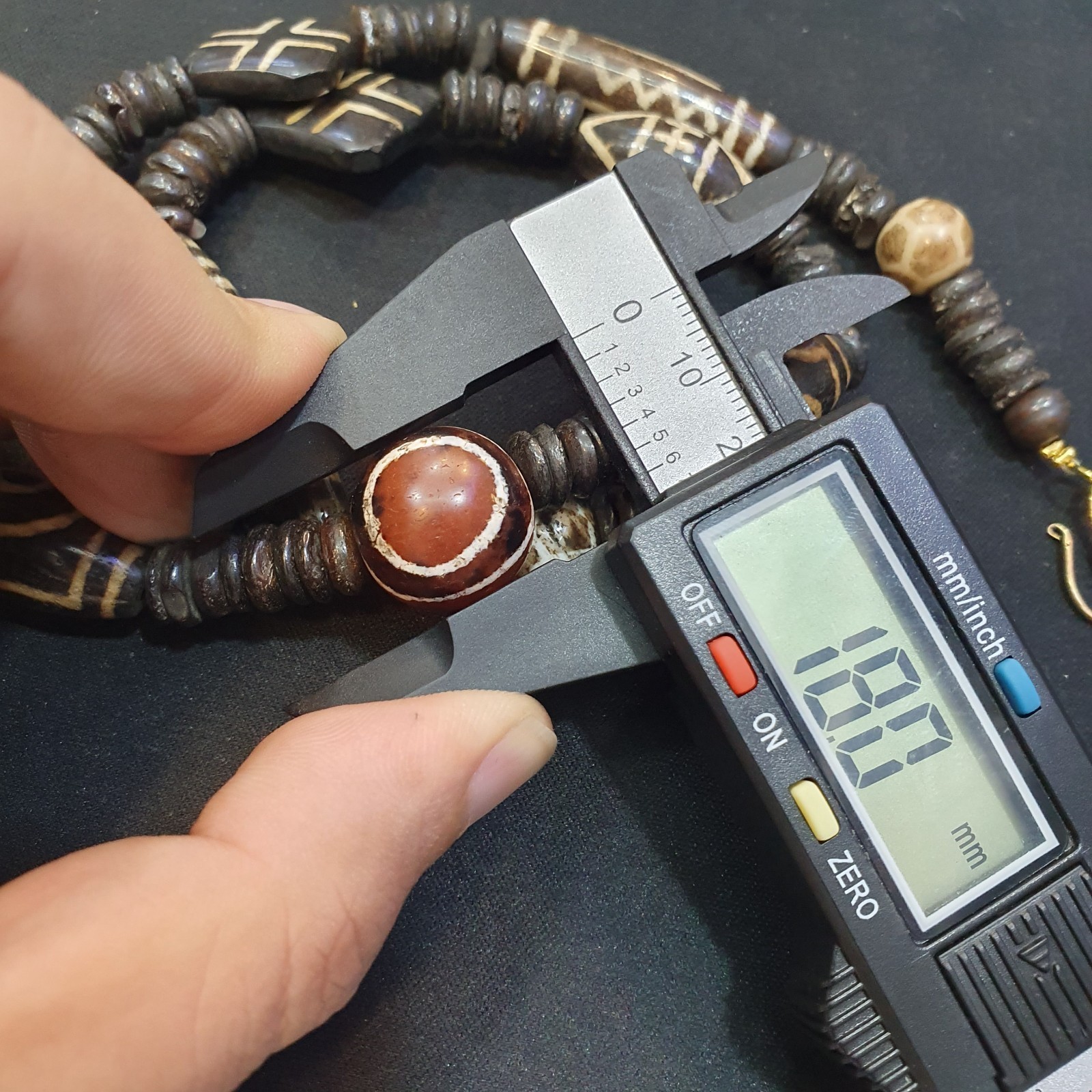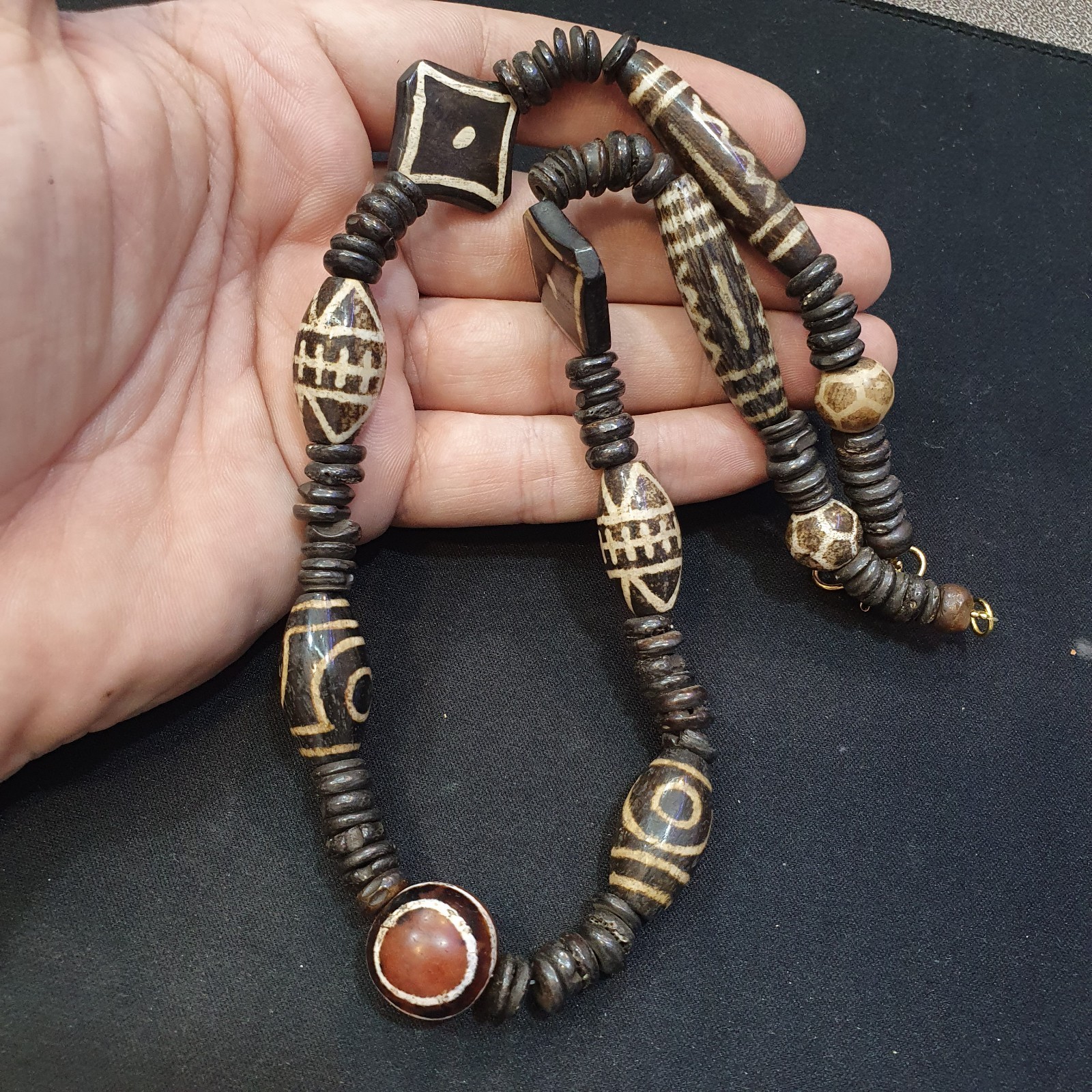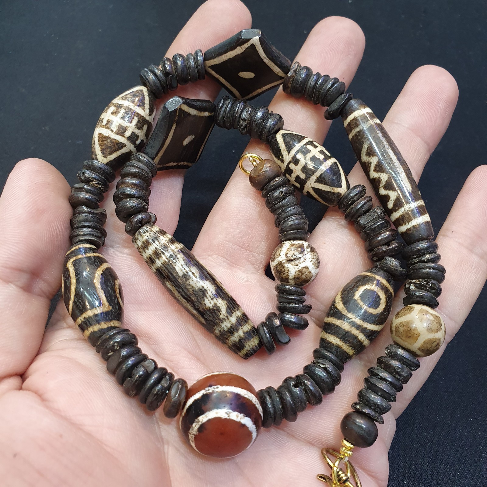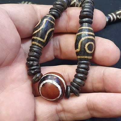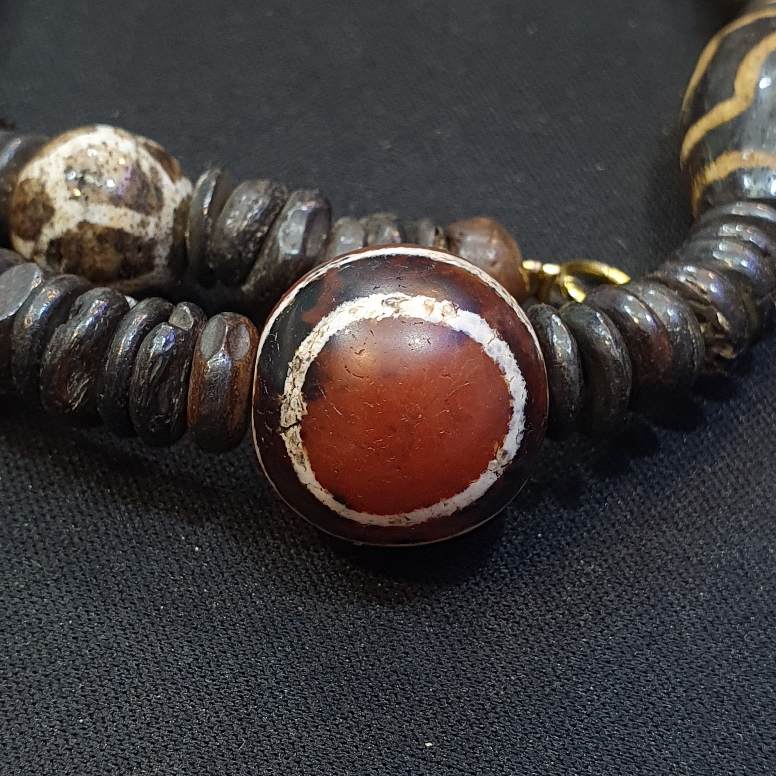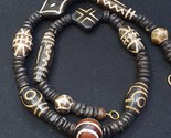 - Collar de cuentas de madera petrificada de ágata Dzi antigua birmana del...