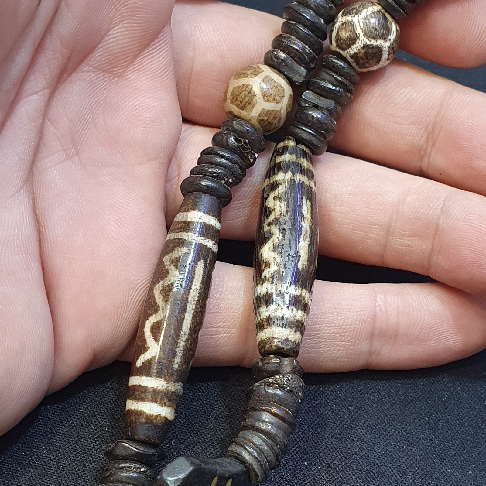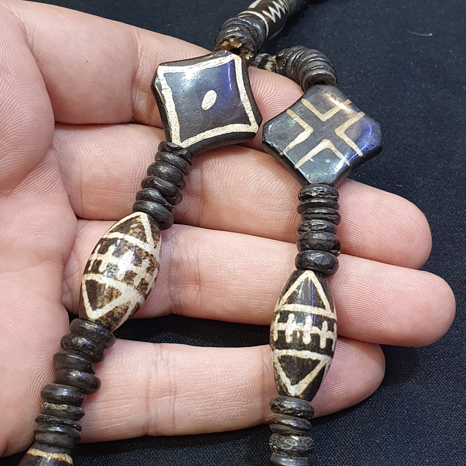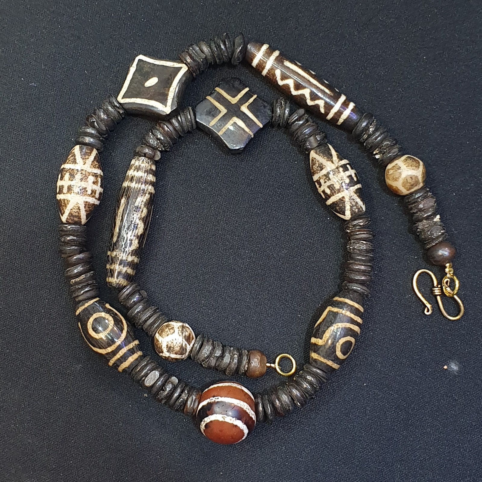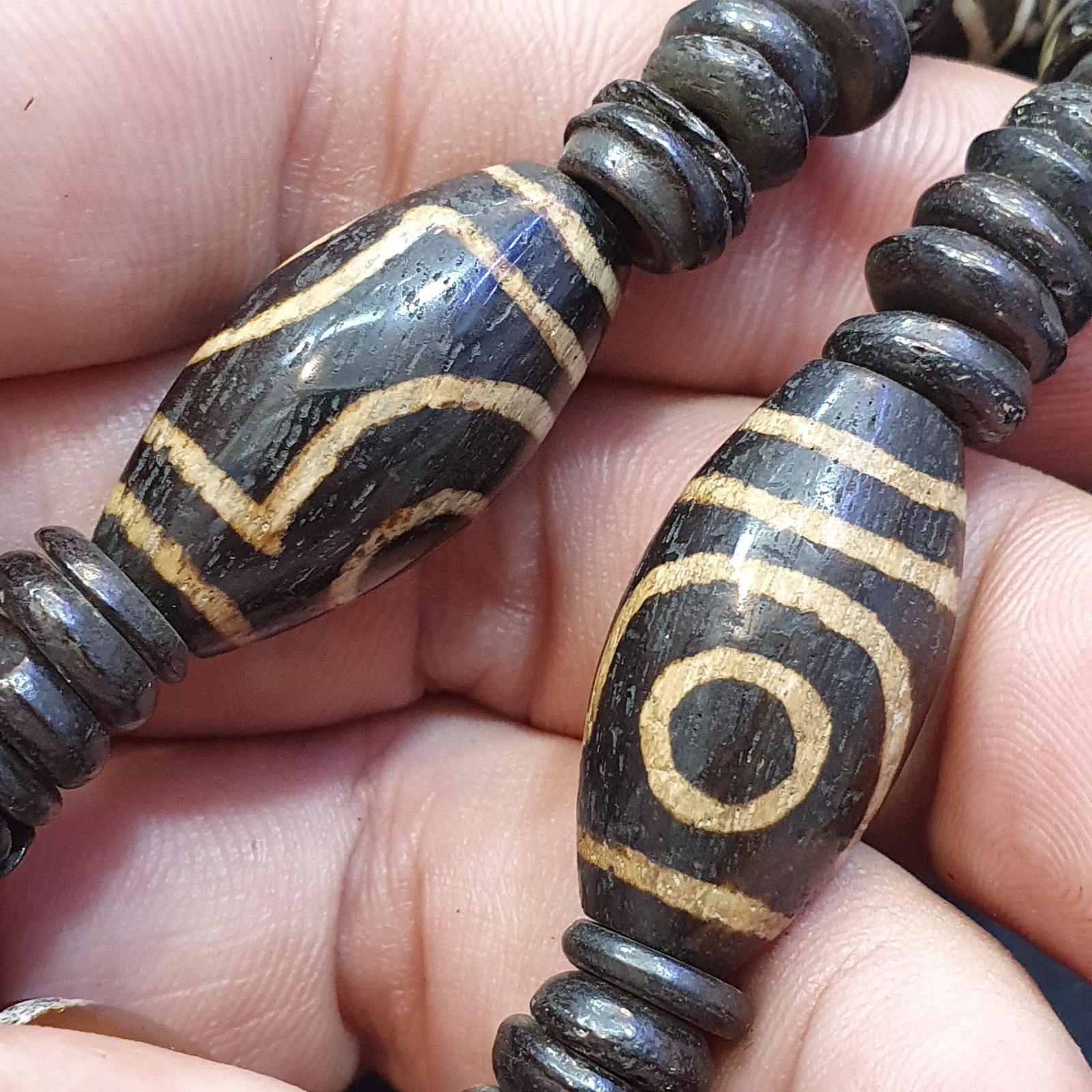 HERMOSO abalorio pumtek. Las cuentas Pumtek de Myanmar (Birmania) - antiguas hasta nuestros días. Incluyendo cuentas antiguas de Pyu/Samon Valley y otras cuentas de reliquia que se encuentran dentro de las regiones de la tribu de las colinas. Con especial enfasis en las cuentas de piedra decoradas. Las cuentas Pumtek estan hechas de esta madera petrificada birmana. Tambien se conocen como 'cuentas de perno de trueno enterradas'.