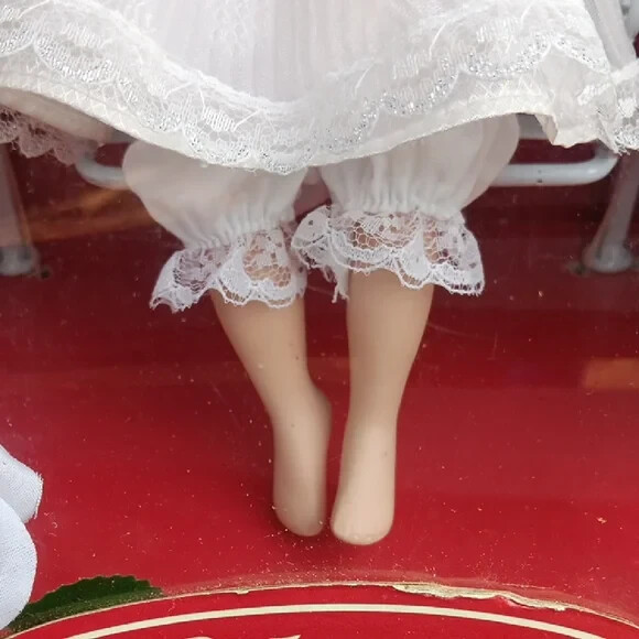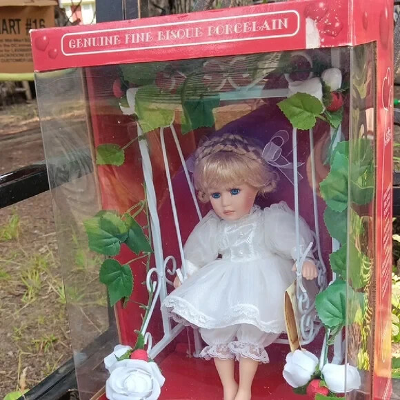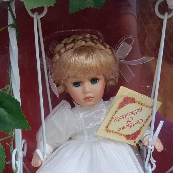 Beautiful porcelain doll seated in a gorgeous white dress. Perfect for any collector. She's been in the box since purchase.