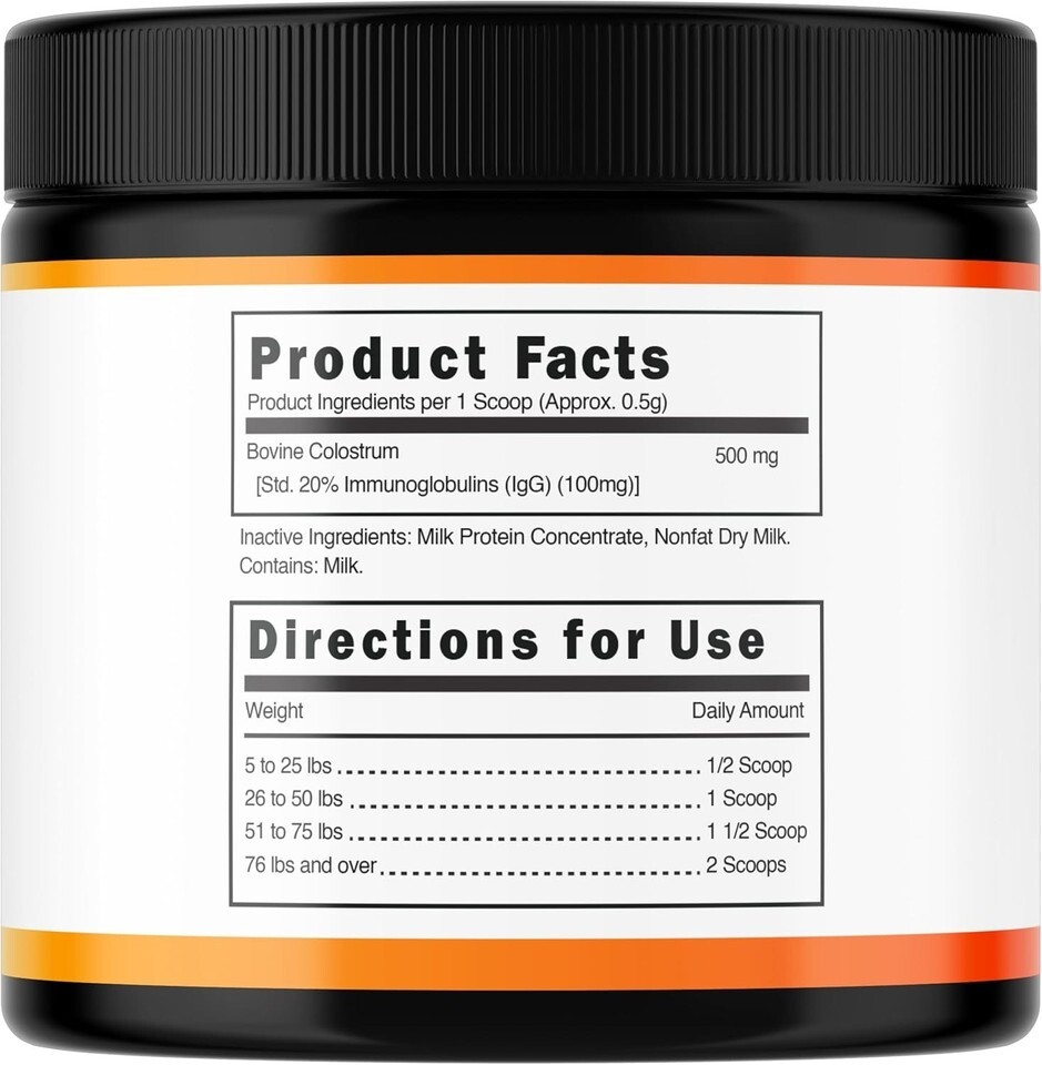Immune Support: Boost your dog's immunity with enhanced levels of bovine colostrum, standardizing to 20% immunoglobulins.
