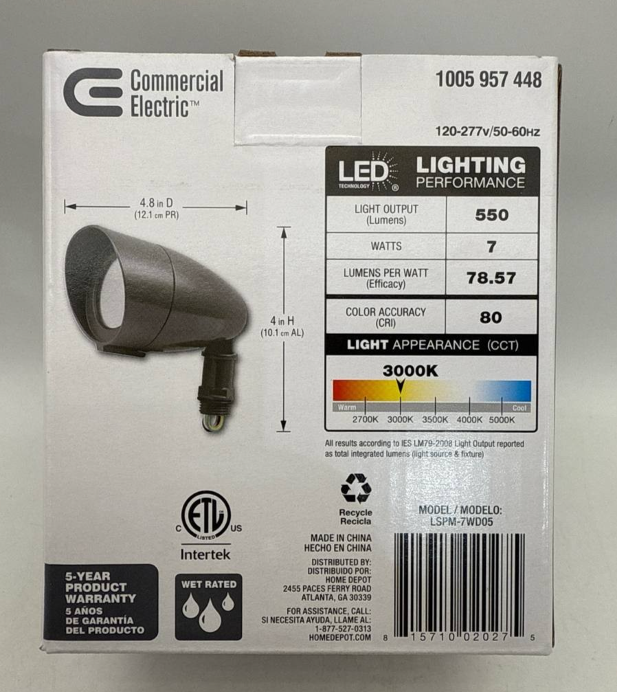 Commercial Electric 7W 550 Lumens Bronze Integrated LED Landscape Flood Light Brand: Commercial Electric Model: LSPM-7W01 Compatibility: Compatible with standard 120V electrical systems, suitable for outdoor landscape lighting applications. Item includes: Please note: This item includes 1x Commercial Electric Landscape Flood Light Only ? As Pictured. No other accessories are included. Quality: Original Condition: New Features: ? Built-in LED light delivers 550 Lumens of bright illumination ? LED lifecycle up to 50,000 hours based on daily usage schedule ? Aluminum construction with powder-coated bronze finish for durability ? Integrated LED technology eliminates the need for bulb replacements ? Suitable for wet locations, ideal for outdoor use ? Easy installation with hardwired connection ? Compact design blends seamlessly into landscape settings Specifications: ? Light Output: 550 Lumens ? Power Consumption: 7 Watts ? Voltage: 120V ? Beam Angle: 60 ? Color Temperature: 3000K (Warm White) ? Material: Aluminum with powder-coated bronze finish Thank you for choosing our Wholesale small business based in Florida. We specialize in Cell Phones and Accessories, although we also offer a variety of closeout lots to cater to diverse customer preferences. With over two decades of experience selling since 2002, we truly understand the significance of your purchase, regardless of the amount spent. Rest assured that we are fully committed to resolving any issues that may arise. Our dedicated team operates from Monday to Friday, 9 am to 5 pm, and we make it a priority to answer all inquiries promptly. We kindly request that you give us the opportunity to address any problems before opening a case or leaving feedback. Your satisfaction is of utmost importance to us, and we will do our best to find a satisfactory solution. Furthermore, we value fairness in pricing, especially for wholesale orders. If you feel that the listed price is not suitable, we encourage you to utilize the Best Offer feature. We are always willing to work with you to reach a mutually beneficial agreement. Once again, we sincerely appreciate your interest in our items. If you have any further questions or require assistance, please don't hesitate to reach out. We are here to serve you.