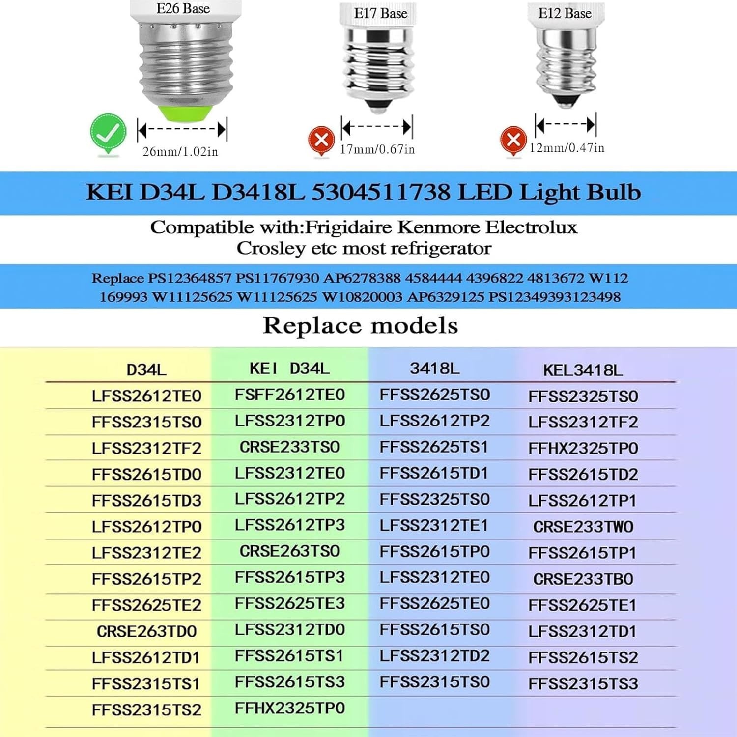 Compatible with Frigidaire and other brands, the KEI D34L Refrigerator Bulb is a durable, energy-efficient choice suitable for refrigerators, freezers, and bedside lamps. Made from ceramic and PC for stylish appearance and heat dissipation, it adheres to various part numbers, ensuring broad compatibility.