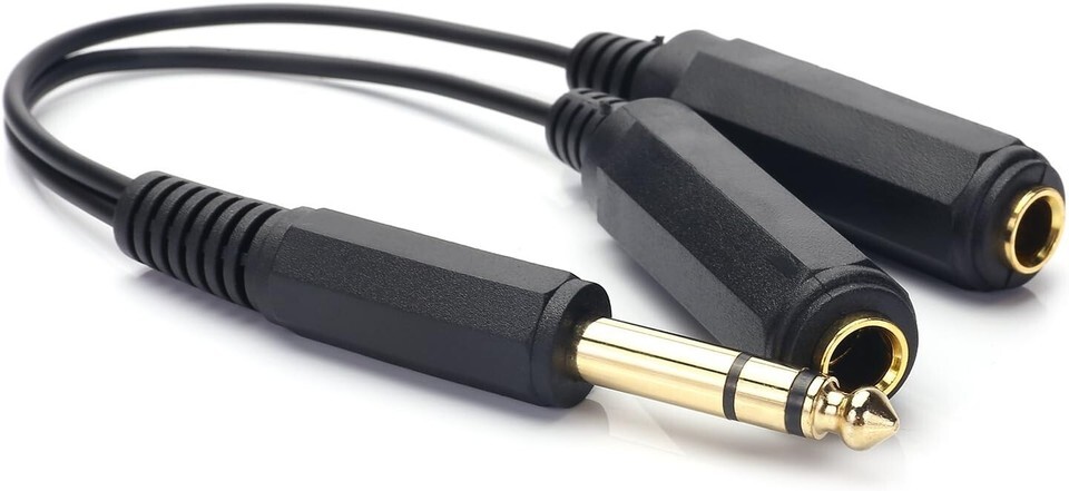 Adapts a headset to audio devices such as amplifiers or AV receivers with a 6.35mm socket.