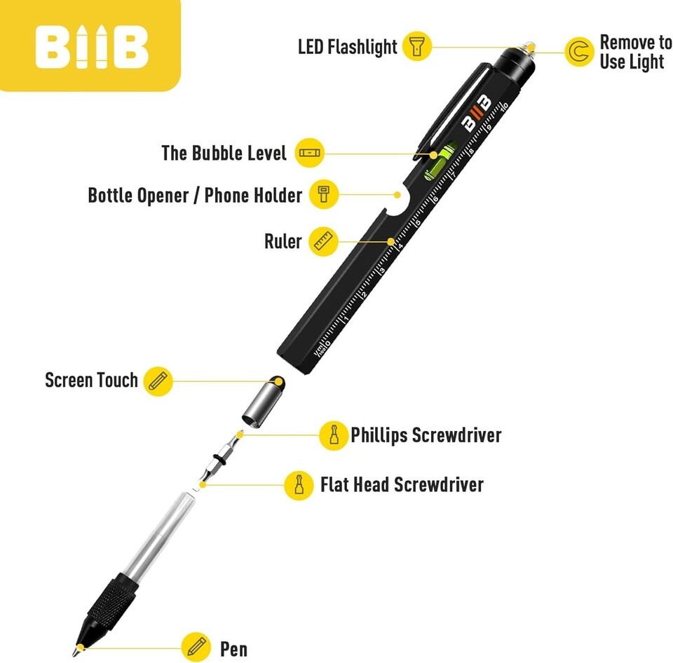9 functions in one tool: twist ballpoint pen, ruler, screwdriver (Flat Phillips), bottle opener (phone holder), stylus, level, and LED flashlight.