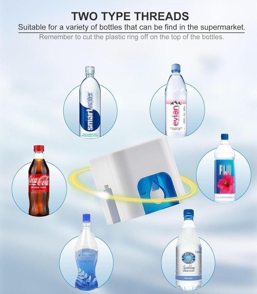 Compatible with standard plastic water bottles ranging from 0.5 to 1.5 liters (16.9 to 50.7 FL Oz).