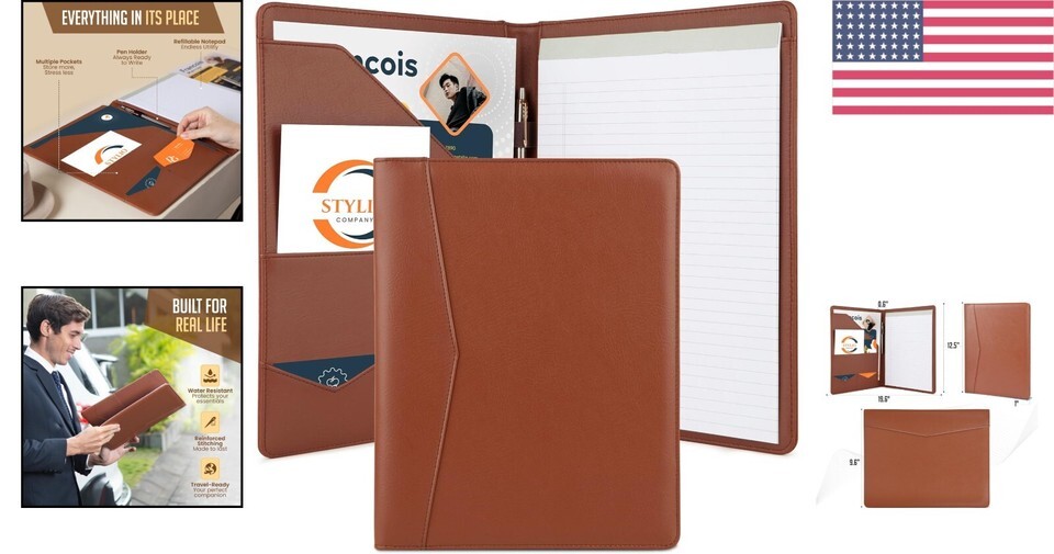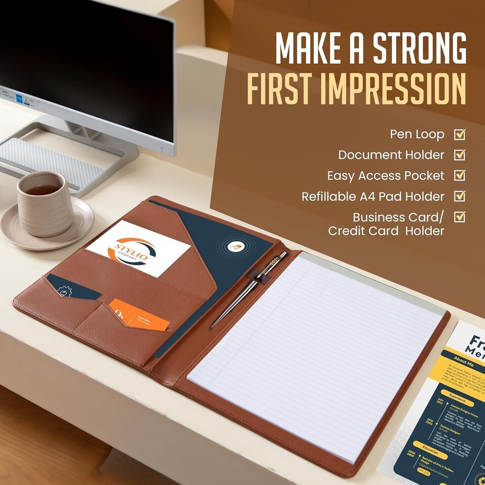 Style Meets Function: Experience elegance in design with safe pockets perfect for documents, business cards, travel tickets, pitch proposals, and resumes. Includes a pen holder and a refillable writing pad.