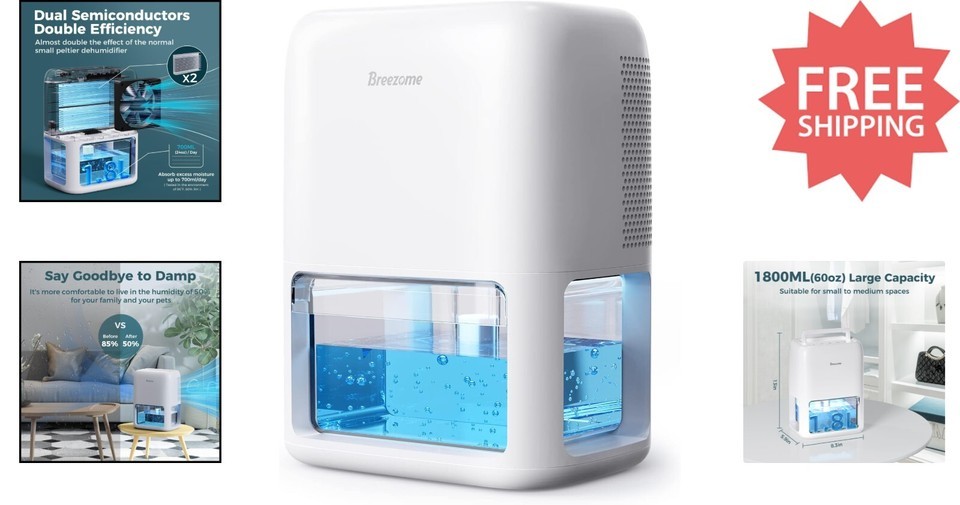 Compact Energy-Efficient Dehumidifier - 60 OZ with Auto Shut-Off Sleep Mode ? ? ? ? ? ? ? ? ? ? ? ? ? ? ? ? ? ? Experience superior moisture control with the BREEZOME dehumidifier, featuring dual semiconductor condensers that nearly double efficiency to absorb up to 700ml of excess moisture daily in small spaces like bathrooms and kitchens. Its 1.8L large capacity tank ensures prolonged operation without frequent emptying, complemented by an auto shut-off indicator. Compact and portable with a built-in handle, it?s perfect for any setting, enhanced by a defrost function for consistent performance. Enjoy a peaceful environment with a quiet sleep mode at 35dB and customizable colorful night lights. The user-friendly timer and low power consumption of 48W make it energy-efficient and convenient. To ensure fast and reliable delivery, we work with multiple fulfillment partners and suppliers. Depending on availability and location, your order may ship from different warehouses or arrive in packaging that varies from item to item. Tracking details are typically provided shortly after shipment, and customer satisfaction remains our top priority. Please note that due to carrier policies and regional regulations, certain items may not be eligible for delivery to specific states or territories. Shipping Free Fast Shipping - We offer free shipping to most of the USA with a normal delivery time of 3-7 days. However, due to the current situation, additional delivery time (up to 3 weeks) may be required for some items. Alternative Carriers - We may use alternative carriers (e.g. USPS, FedEx, UPS, etc.) to ensure your package arrives safely and on time. Due to the use of multiple carriers, we are unable to provide a tracking number automatically. Handling Time - Orders are processed and shipped within 1-2 business days of receiving cleared payment. Shipping Restrictions - Shipping to Alaska, Hawaii, Puerto Rico, Guam, and other US territories may incur shipping charges or delivery restrictions. Please contact us before ordering, or your order can be refunded/cancelled. State Restrictions - There may be restrictions based on your state of purchase. For example, certain items may not be shipped to California due to state regulations. Contact for Tracking Updates - If you require tracking updates or have any concerns about the delivery of your order, please feel free to contact us, and we will be happy to assist you. Return 30-Day Hassle-Free Returns - We want you to be completely satisfied with your purchase. If you are not, you can return the item within 30 days of receiving it for a full refund or exchange. Easy Return Process - To start a return, simply contact us and we will provide you with a prepaid return shipping label and detailed instructions. Restocking Fee - There are no restocking fees for returns. However, the buyer is responsible for return shipping costs if the return is not due to a seller's error. Refund Processing Time - Refunds will be processed within 5 business days of receiving the returned item in its condition. Payment We accept all major credit cards, PayPal, and Apple Pay for your convenience. Your payment information is secure and encrypted to ensure a safe and seamless transaction. Please complete your payment within 3 days of purchase to avoid any delays in shipping. Feedback Your feedback is extremely important to us. We strive to provide the best products and customer service possible. If you are satisfied with your purchase, please take a moment to leave us a positive review. If you have any concerns or issues with your order, please contact us before leaving negative feedback. We are committed to resolving any problems and ensuring your satisfaction. Contact Us If you have any questions or concerns, please feel free to out to our customer support team. You can contact us through the messaging system. We are available Monday to Friday, 9:00 am to 5:00 pm EST, and we will do our best to respond to your inquiry within 24 hours. Buy it now and enjoy a pleasant shopping experience! Unit Quantity: 1.8L (60 OZ) Features: Timer,Quiet Sleep Mode,Auto Shut-Off,Color Changing Light,Defrost Function,Dual-Semiconductor Condenser,Quiet Operation,Portable Design,Large Capacity Water Tank,Adjustment Night Light,Auto Defrost Application: Bathroom,Cloakroom,RV,Kitchen,Home Room: Bathroom,Bedroom,Kitchen,Cloakroom,RV Recommended Room Size: Medium,Large Control Style: Digital,Push Button Power Source: Battery,Electric Smart Home Compatibility: None Smart Home Protocol: None Material: Plastic Type: Mini Tank Capacity: 1.8 Liters (60 oz) Color: White Voltage: 220 V Item Depth: 6.26 in Item Height: 11.34 Inches Item Weight: 1.7 kg Power: 48 W Daily Moisture Removal Capacity: 0.56 L Timer Control: 12-24-36-48 hours Number of Speeds: 1 Coverage: 350 sq ft Operating Sound Rating: 35 dB Finish: Glossy Unit Type: Unit