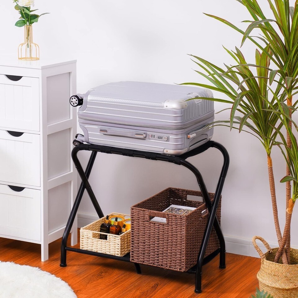 Embrace convenience and elegance with our Compact Luggage Rack Set. This thoughtfully crafted luggage solution not only gives your luggage the elevation it needs but also serves as an attractive storage option in your guest room. With the added shelf for tote bags or shoes and the ability to adjust for level surfaces, it's designed to make your life easier.