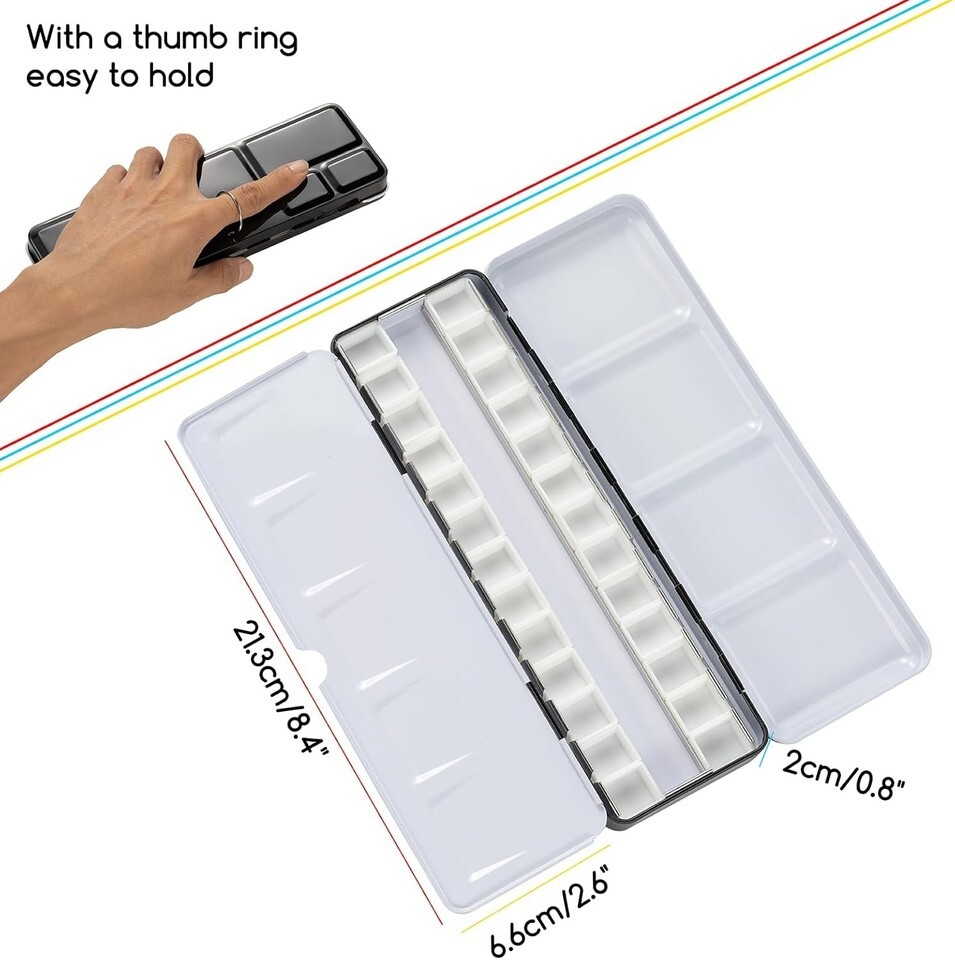 Includes 26 empty watercolor half pans, each with a capacity of 1.8 ml, perfectly fitting in the tray.