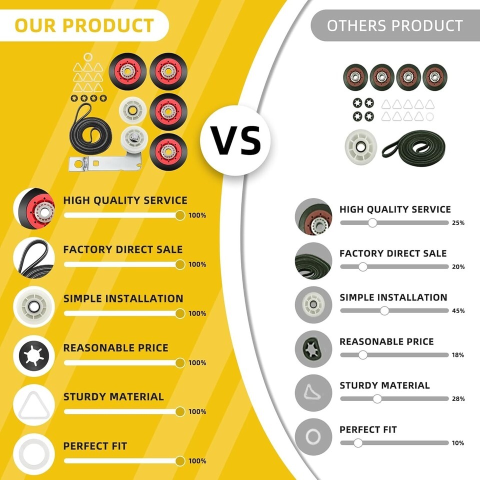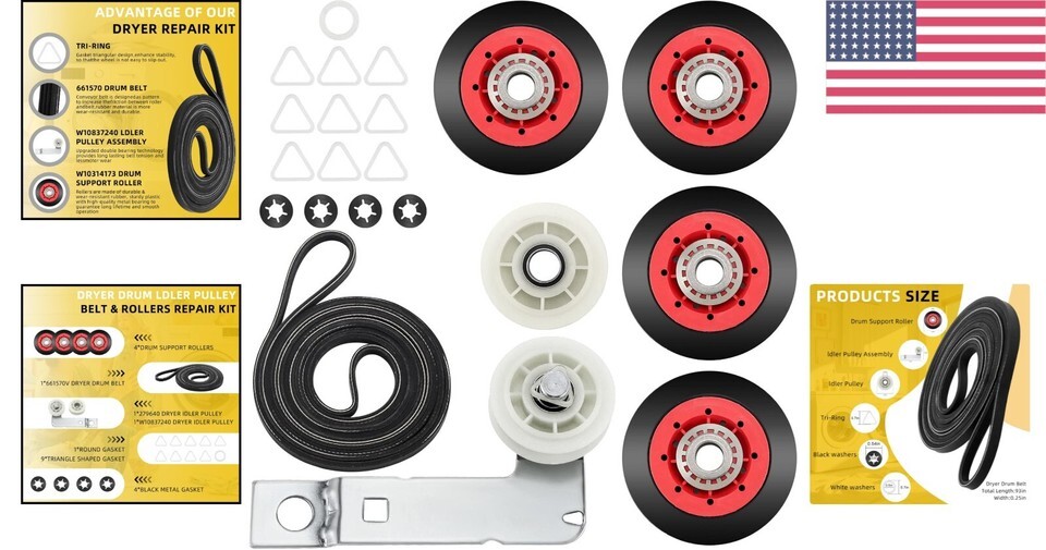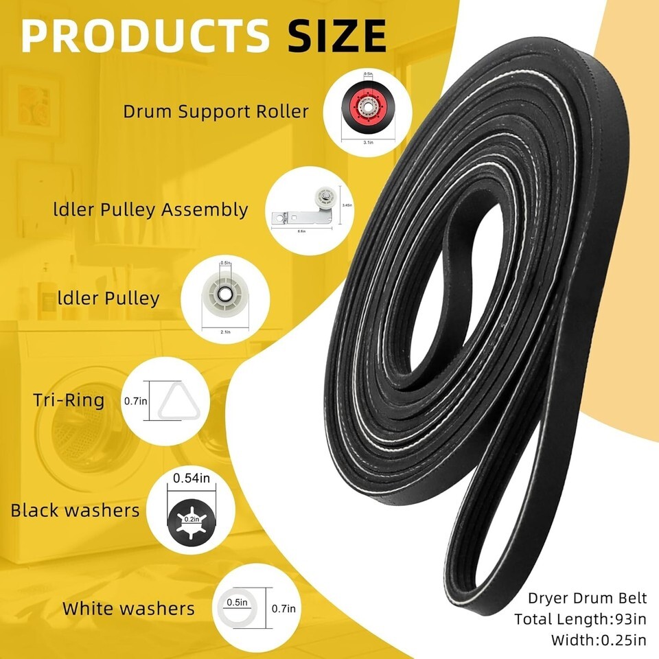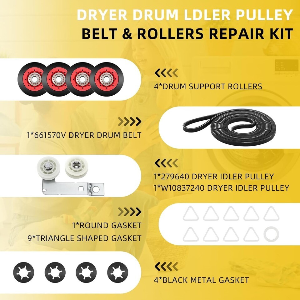 Set Includes: Repair Kit,1*661570V dryer drum belt,1*W10837240 dryer idler pulley,4*drum support rollers,1*279640 dryer idler pulley,4392067 dryer repair kit
