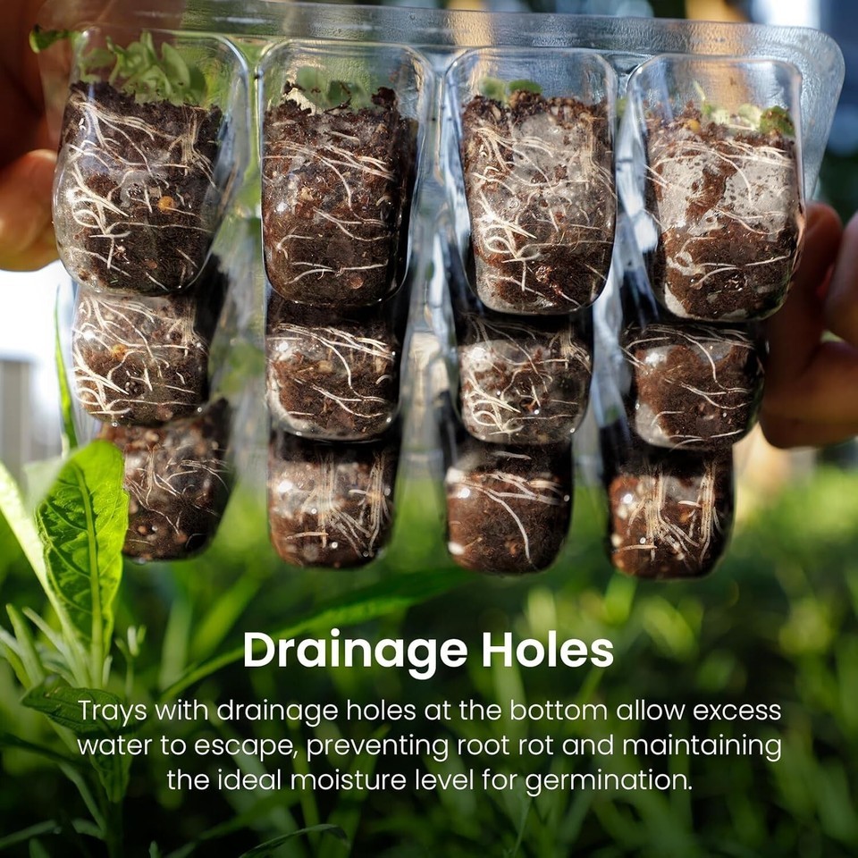Monitor your plant growth with our unique, high-quality clear plastic seed trays. Designed for easy observation without disturbance, these trays give you full control over the germination environment with adjustable vents for temperature and humidity regulation. Each large cell (1.9" x 2.1") accommodates sizeable seeds like tomatoes, peppers, and eggplants, supporting robust root development before transplantation. Features include drainage holes for optimal watering, reusability, and efficient growth. Enhance your indoor gardening with our full spectrum LED grow lights that mimic natural sunlight, ensuring healthier, faster-growing plants.