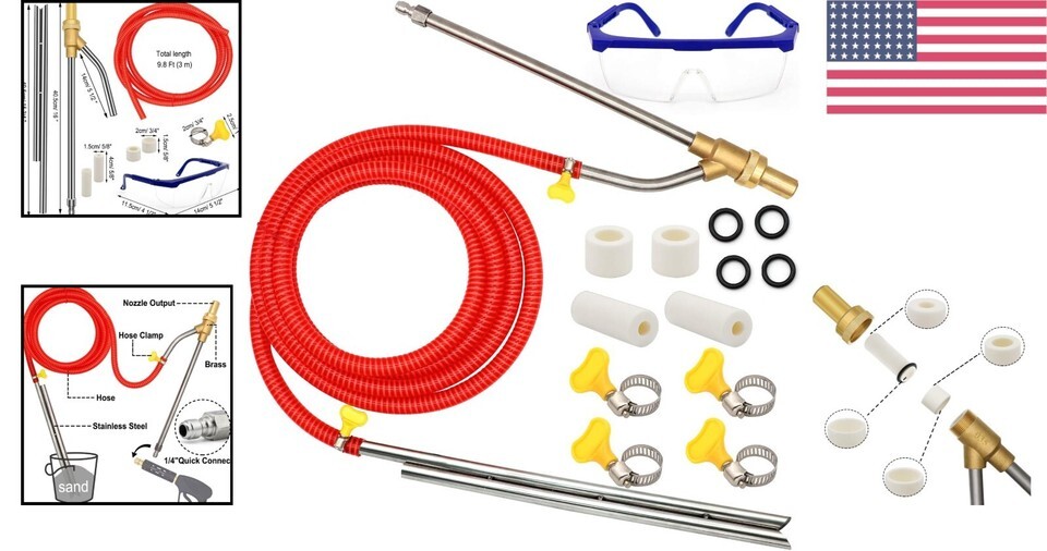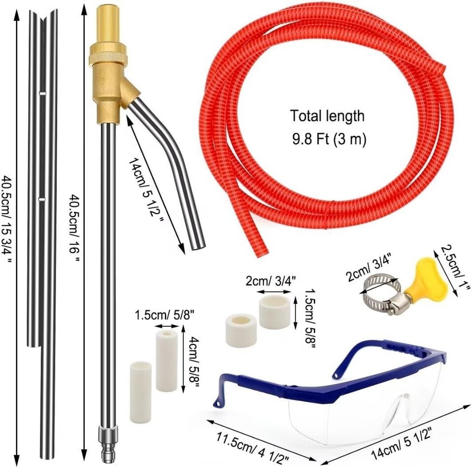 Items Included: Hose,3 m Hose,16 Inch Pressure Washer Wand,15 3/4 Inch Sand Wand,Goggle,4 Hose Clamps,4 Ceramic Nozzles,2 Rubber Bands