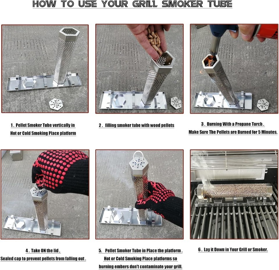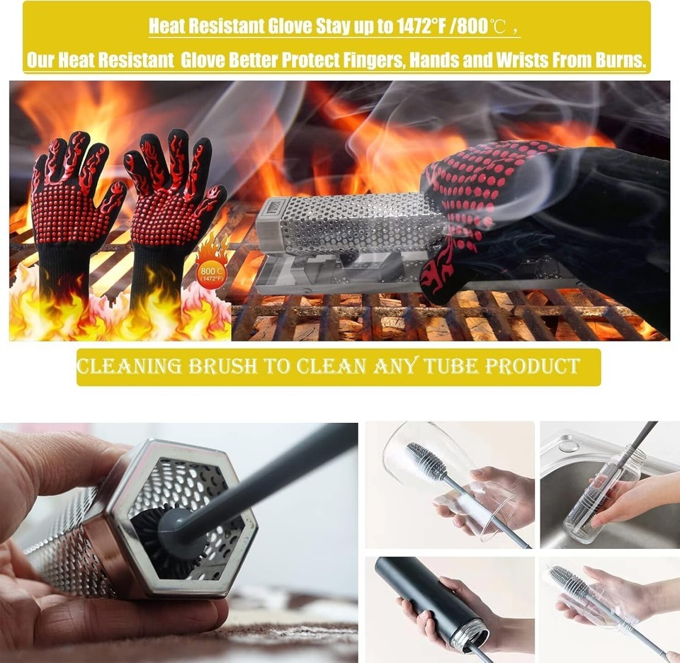 Complete Smoker Tube Combo: Includes everything you need?a 12? smoke tube, a place platform, 2 S-shaped hanging hooks, a cleaning brush, and a heat-resistant grill glove (single, not pair) for an all-inclusive grilling experience.