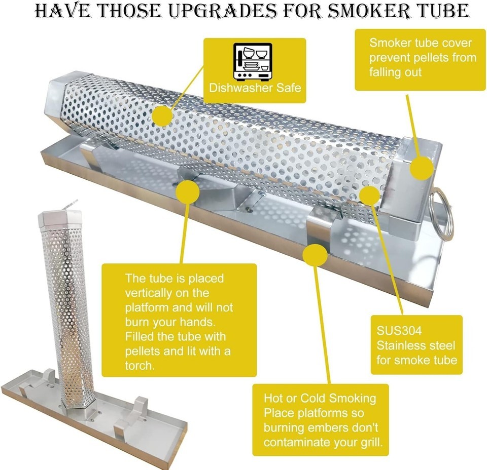 Upgraded Pellet Tube for Smoking: Designed for stability, our tube can be placed vertically, ensuring it won?t tip over while in use. The intelligent tube cover ensures no particles escape while you smoke your favorite meats, and the platform prevents contaminants from tainting your grill.
