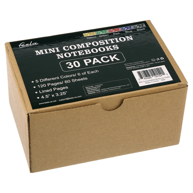 Feela 30 Pack 5 Colors Composition Notebooks include 5 different colors pocket sized cute composition notebooks. Each color has 6 duplicates and measures 4.5 x 3.25 inches, which is perfect to carry in pockets and easily held by young girls and boys. Feela Composition Notebooks have 5 different bright colors: Black, Blue, Green, Red and Yellow. You can distinguish different subjects or notes with different colors. This special marble pattern on the cover is carefully picked in order to give you a better visual experience. All of notebooks are all blank inside with 120 lined pages (60 Sheets), which would be enough for daily usage. Every page is narrow lined and the line space is 1/4 inches. Feela Composition Notebook would be perfect for many people and lots of occasions, suitable for students, commuters and your small girls and boys.