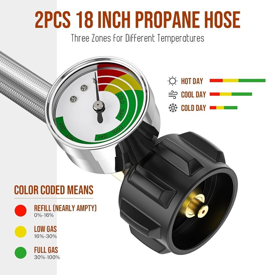 2 Pack 18'' Stainless Braided QCC1 1/4" Inverted Male Flare RV Pigtail Propane Hoses with Gauge