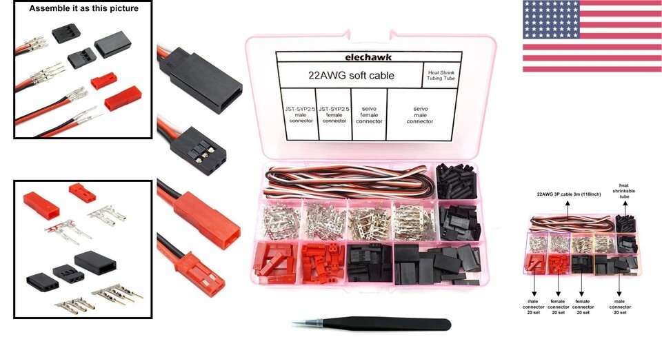 Elevate your RC projects with our Comprehensive RC Connector Set, meticulously designed for compatibility and durability. From the robust 22AWG cables to the precision crimp pins, every detail has been thoughtfully crafted to meet your DIY needs and repair tasks. This set not only saves you time but ensures you have the right connectors at your fingertips, whether you're extending a servo connection or powering your favorite RC aircraft.