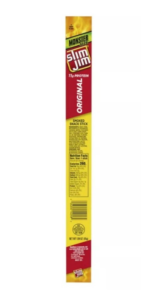Conagra 112441 Slim Jim Monster Smoked Meat Stick Original Flavor 1.94 oz., 1 Single Stick SKU: CON-112441-MC-TC This sale transaction is for a Conagra 112441 Slim Jim Monster Smoked Meat Stick Original Flavor 1.94 oz., 1 Single Stick. Included exactly what is pictured. Experience intense, smoky flavor with delicious Slim Jim Monster Size Original Meat Sticks. Made with spicy beef, pork and chicken, these meat sticks contain no artificial flavors or colors for full meaty flavor everyone can love. Each meat stick serving is loaded with 11 grams of protein, ideal for protein snacks that kick hunger to the curb and leave you feeling satisfied. These individually wrapped snacks go where you go and are perfect as travel snacks, school snacks or anywhere meat snacks. Slim Jim Monster Size Original Meat Sticks offer a bold and tasty way to take on the day. Each snack stick is perfect for individual snacks, so you are ready to hit back when savory cravings hit. Slim Jim keeps it interesting with a full line of beef sticks, snack sticks, pork rinds and jerky. Features: One 1.94 oz package of Slim Jim Monster Size Original Meat Sticks Each Slim Jim Monster Size Original Meat Stick brings a bold, original flavor for satisfying snacks Slim Jim meat snacks use spicy beef, pork and chicken, because beefy appetites require an even beefier snack This meat snack contains 11 grams of protein per serving These individually wrapped snacks are highly portable, on-the-go meat sticks that'll kick hunger to the curb TERMS OF SALE: If, after receiving this item you discover that it was not the one you wanted, simply return it for a full refund within 30 days. Refund is void if you have installed, used, or damaged the item in any way. Item must be returned with its original box, packing materials, and instructions (if applicable) Cleared payment must be received within 2 days of the transaction prior to shipping. SHIPPING: Any posted shipping only applies to the U.S. 48 States PR. All other areas/regions will be automatically calculated with the shipping calculator and are based on your location. International buyers: Customs fees, duties, taxes, tariffs other fees are your responsibility. Arrival time will depend on your location. Please allow for ample shipping time for international destinations. If you have any questions, feel free to ask. Thank you for visiting!