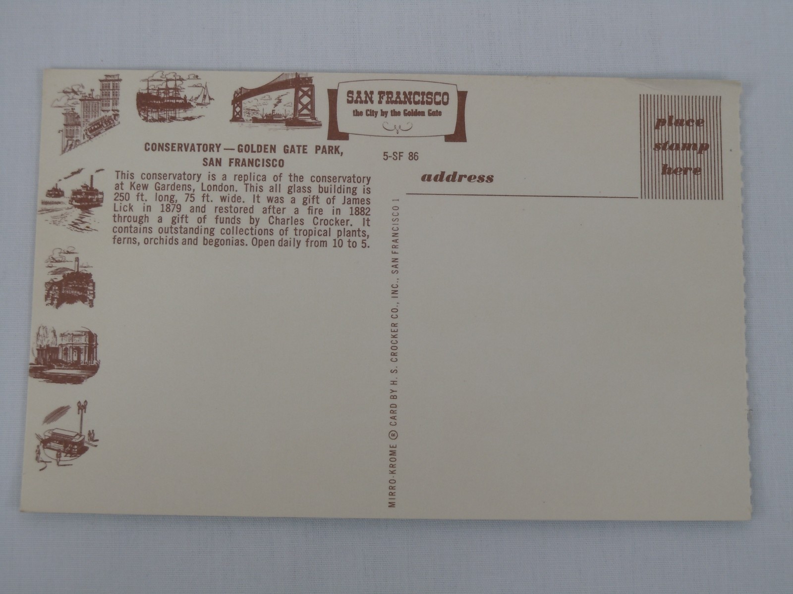 This is for a Conservatory - Golden State Park, San Francisco California Vintage Postcard. has a small crease on the corner. it is unposted. Please refer to photos for condition. Any questions please ask.