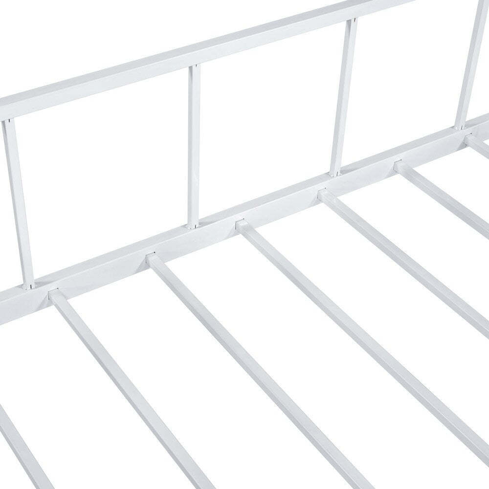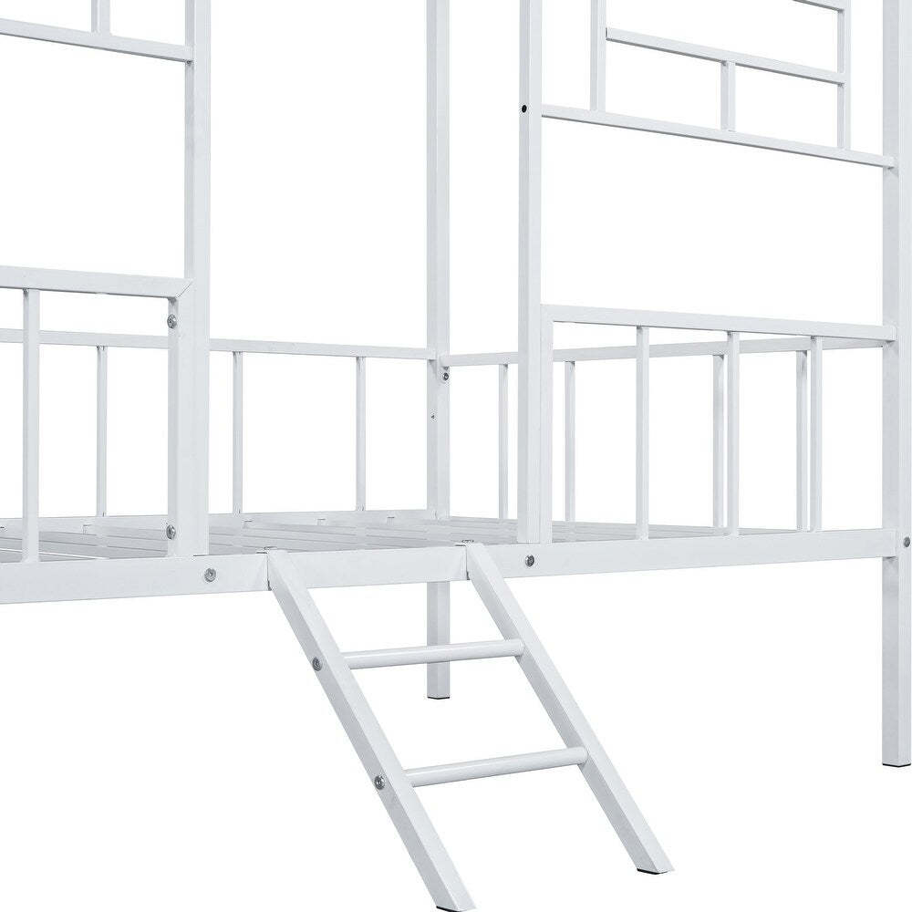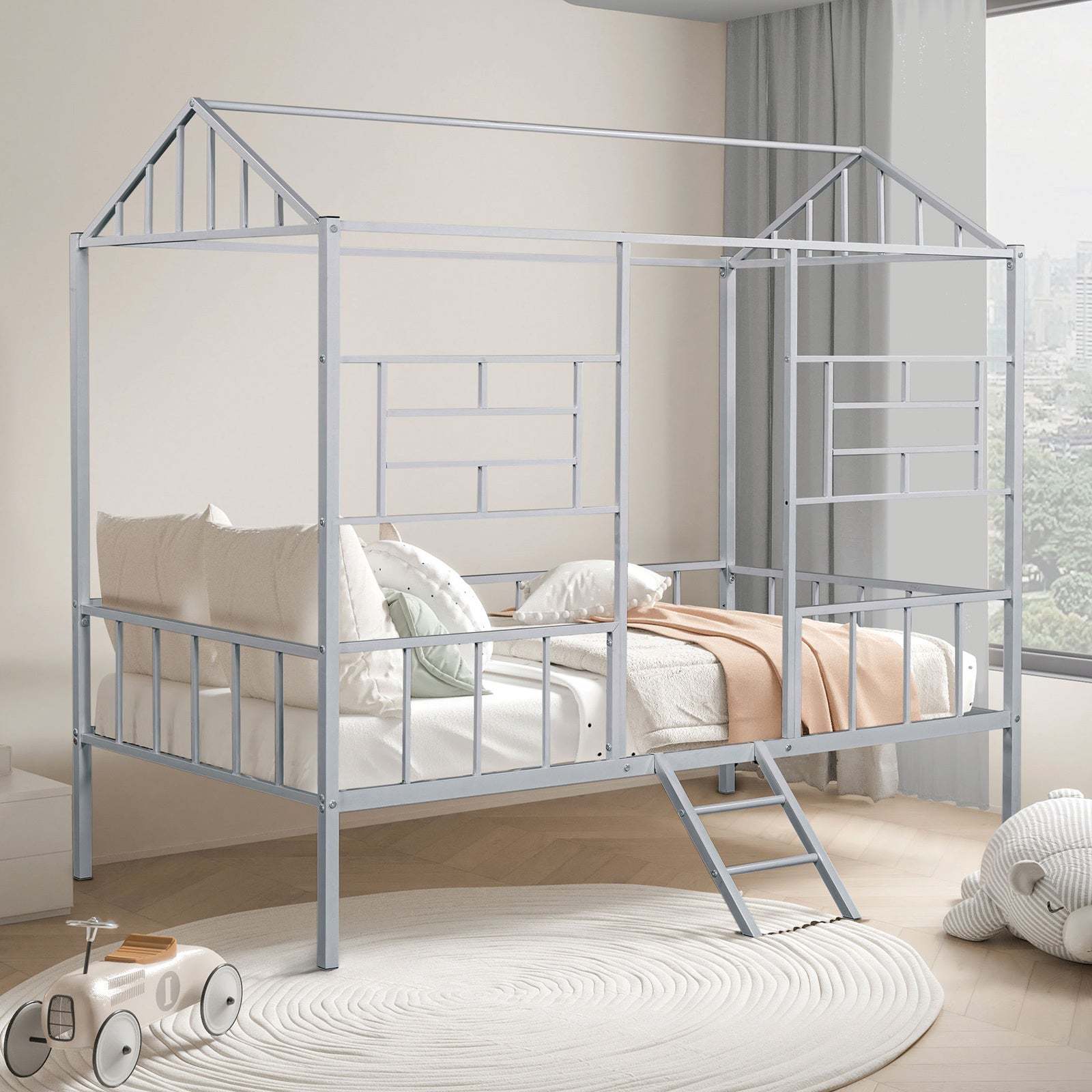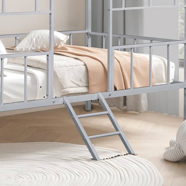 - Contemporary Silver Metal House Twin Bunk Bed w/ Angled Ladder