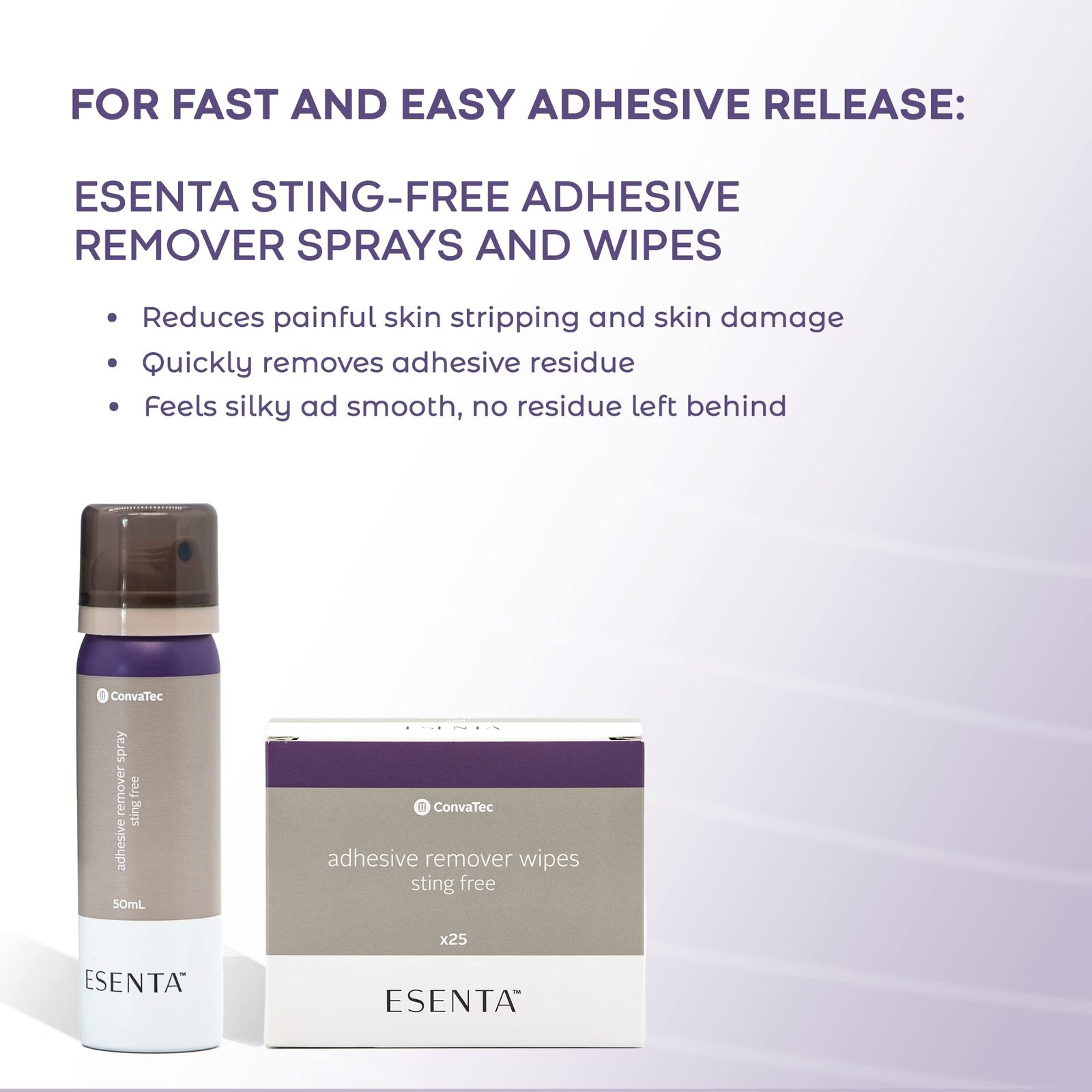 Product description: The new ESENTA Sting-Free Adhesive Remover is a skin-friendly, quick, and easy way to get rid of the adhesive residue that often gets left behind during ostomy pouch changes. ConvaTec ESENTA Sting Free Adhesive Remover is available in two options: spray can or individual wipes. Formerly known as Sensi-Care, the 100% silicone-based ESENTA Adhesive Remover helps reduce potential skin damage like skin-stripping while quickly removing all remaining adhesive residue. It's made without natural rubber latex, which makes it ideal for those with latex allergies or sensitivities. Plus, your skin will feel silky and smooth with no residue left behind, whether you use the ESENTA Sting-Free Adhesive Remover Spray or the ESENTA Sting-Free Adhesive Remover Wipes.