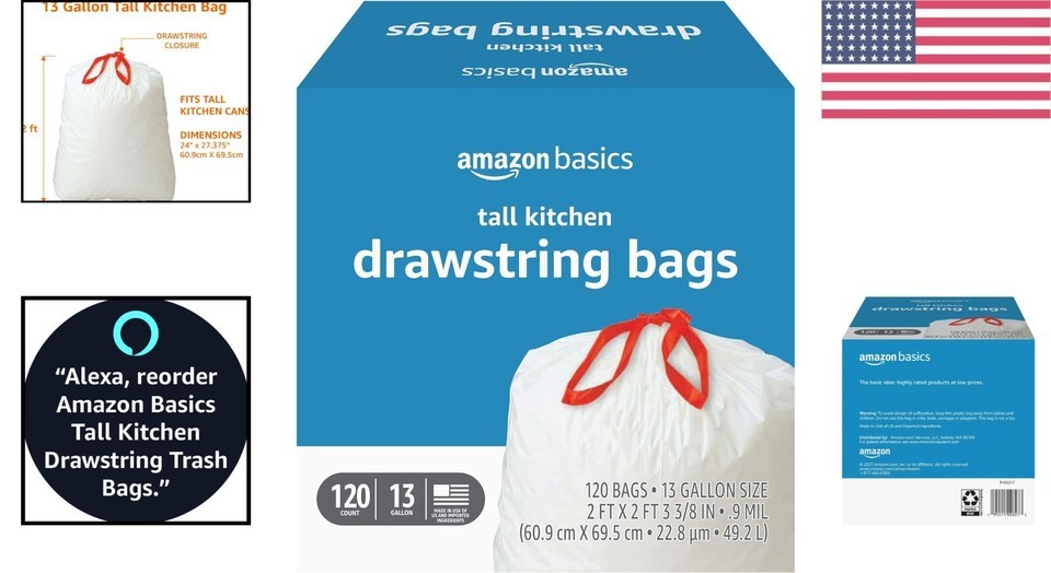 Conveniently compatible with Alexa voice shopping; simply say, "Alexa, reorder Tall Kitchen Drawstring Trash Bags" for seamless restocking.