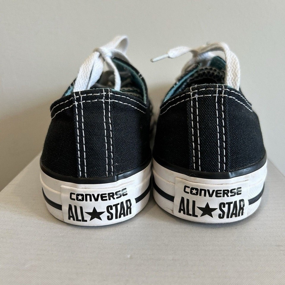 * Converse All-Star Low Double Tongue Sneakers * Color: Black with teal accents * Material: Fabric * Size: 6.5 * See photos for more information / feel free to reach out with any questions * Condition: Only worn once - very nice condition. See photos Item will ship via USPS Ground Advantage unless buyer would prefer to expedite for an additional cost.