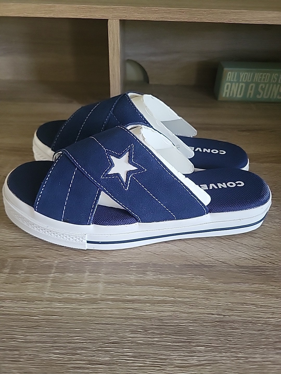 Brand New, No Box! Converse Women's One Star Slip-On Sandals Shoes Navy/Egret/White Size: 8 FEATURES: the Converse One Star Sandal Slip offers a retro vibe with a summery feel. Constructed with a suede cross-straps and memory foam sole, the slipper combines comfort and a signature ?90s look in one silhouette. Converse One Star Sandal Slip Navy - Suede cross strap upper - Memory foam - Soft and hard EVA layers - Foxing tape and rubber sole GREAT ITEM AT A GREAT PRICE!!
