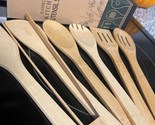About this item 7 Pieces Utensils: Included fried spatula, slotted spoon, strainer spoon, soup ladle, salad fork, spatula, kitchen tongs. Go from cooking to serving, let the dishes have a natural and fresh flavor Healthy Safe: Natural bamboo wood, fine texture on the surface, clearly visible; light weight and solid quality, which is highly renewable, it is a great sustainable option Easy To Store: The insulated handle protects your hands from injury, and the tail with round hole design to hang up, more convenient storage, saving kitchen space without chaos Easy To Maintain: Simply wash with mild soap and water, and dry thoroughly to store. Please do not put bamboo spatula into the dishwasher and soak them, and regularly care these wooden spoons with oil Multipurpose: Our wooden utensils for cooking is perfect for stirring, serving, mixing, tossing and tasting. Multiple specifications are available, which helps you create a culinary masterpieces. As a great gift for mom, dad or any cook