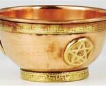 This fantastic offering bowl has been sculpted of copper, leaving it with a beautiful red-gold finish both on its interior and exterior. This natural coloring is further amplified by the brass accents with which it is decorated, depicting ornamental scroll work encircling the rim and the base of the bowl, and the beautifully sculpted Pentagram symbols that run along the exterior of the bowl.