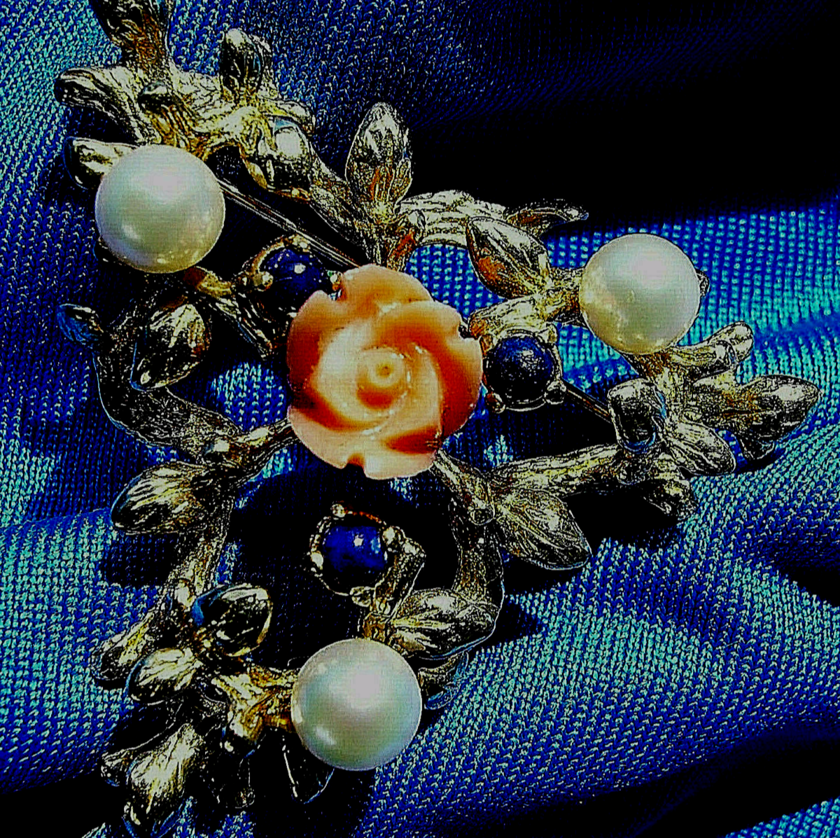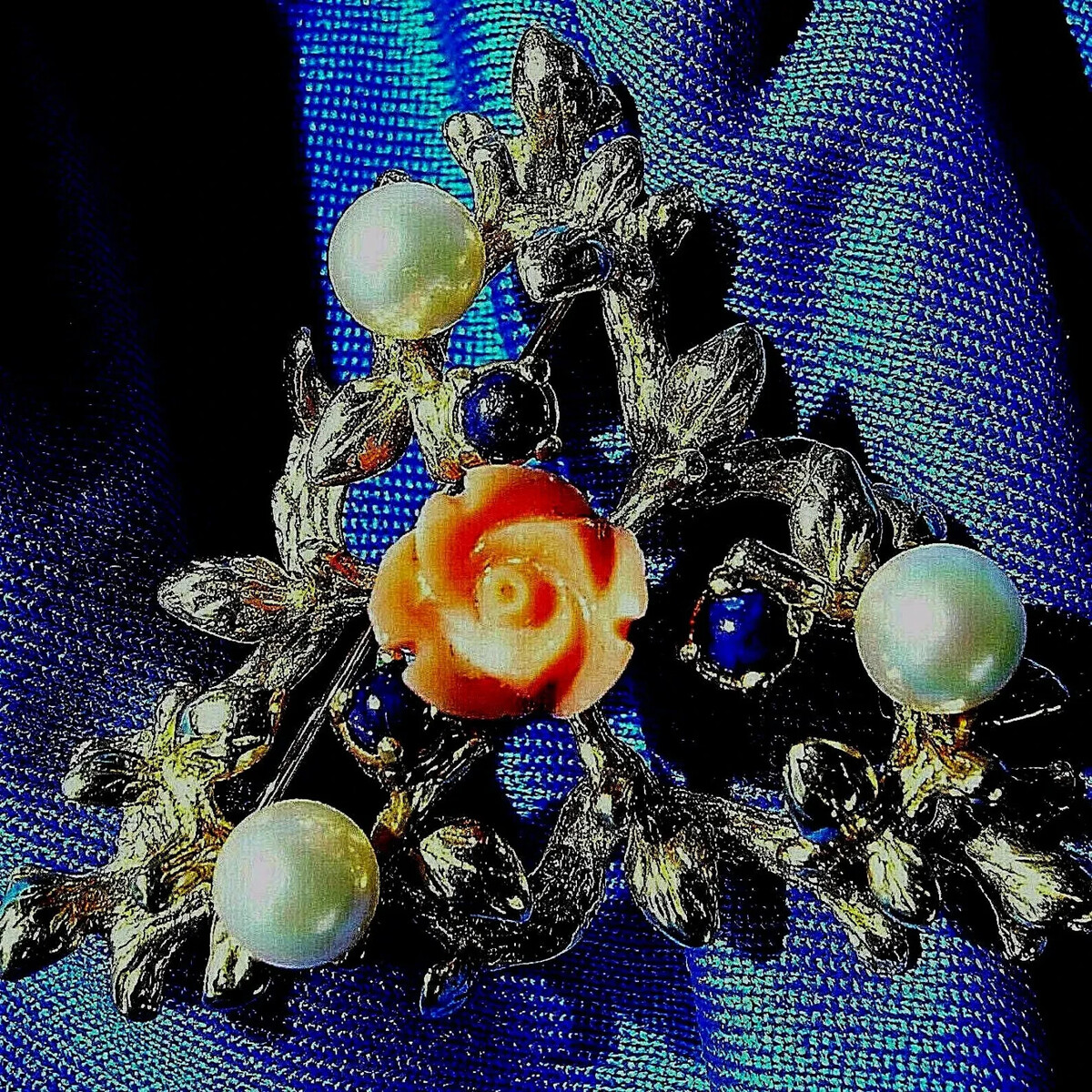 DESIGNER CORAL, LAPIS LAZULI, PEARL HAND MADE BROOCH 14K.