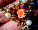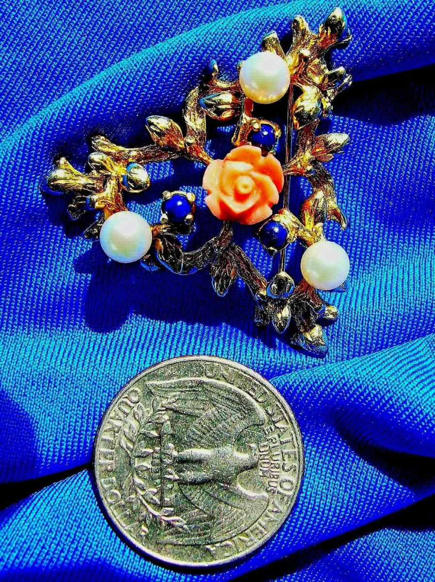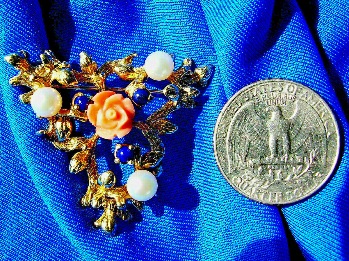 - Coral Pearls Lapis Brooch Floral Design Deco Statement Solid 14k Gold 11.4 grams