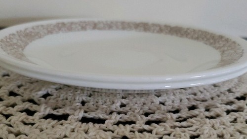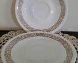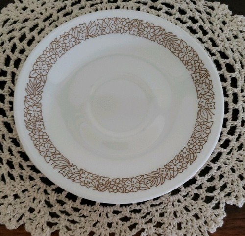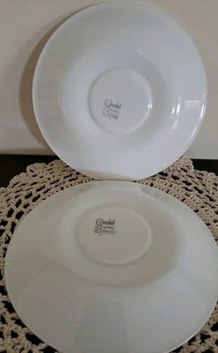 This sale is for a set of Two (2) Corelle Corning Saucers Woodland Brown Design Saucers are solid white in color with a brown floral design around edge Saucers are 6.25" diameter Clean lines and a round profile give the plate its modern style and limitless versatility Inspired by the artsy charm of Market Street in the hometown of Corning, New York, these saucers have a warm-white hue with a brown floral edge around rim Nothing-else-like-it... triple-layer-strong glass highly resists chips and cracks Lightweight and easy to handle Ultra-hygienic, non-porous and easy-to-clean glass Saucerss stack compactly taking up half the space of ceramic dishes Dishwasher, microwave and preheated-oven safe Made in Corning, New York Saucers are in good condition, no cracks chips or repairs Please view photos for a good description of these saucers Thank you!