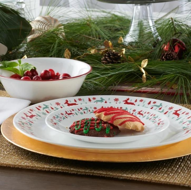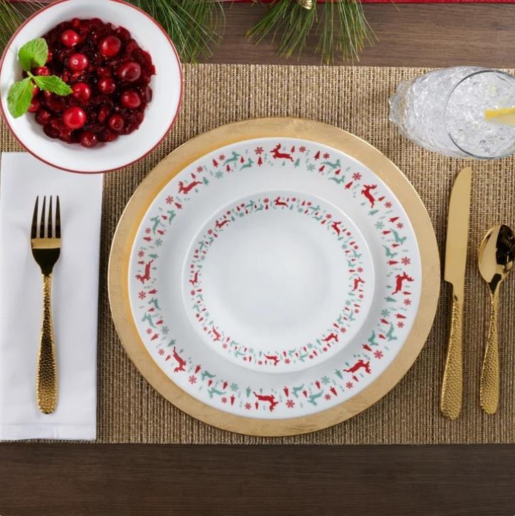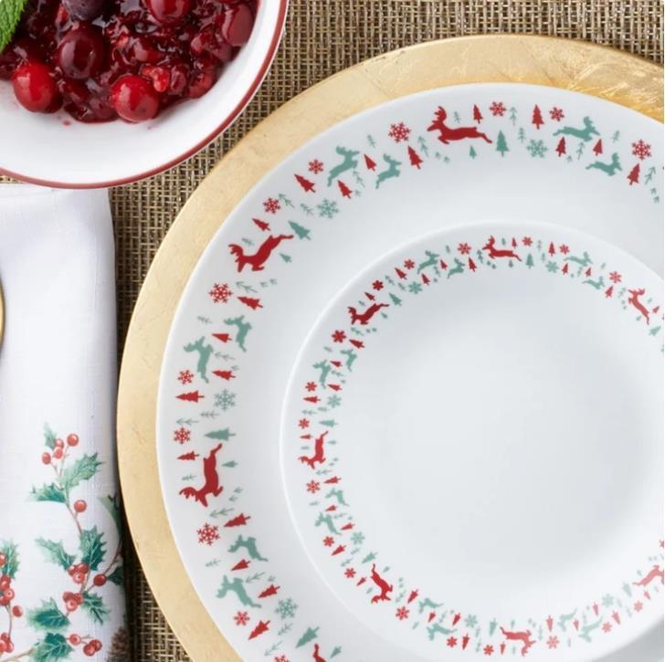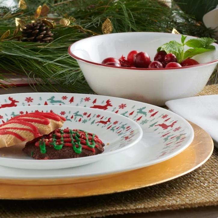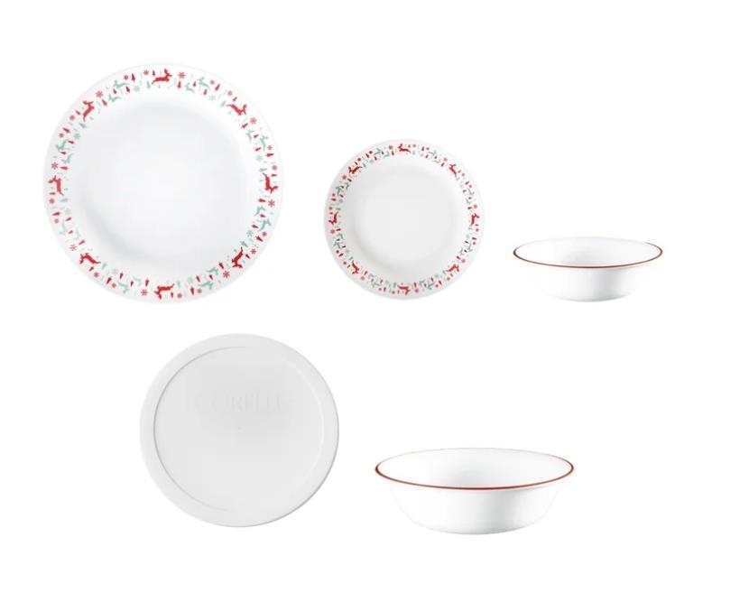 This Corelle Be Merry 20-piece Dinnerware Set for four features reindeer in crimson and sage gleefully frolicking amongst sparkling snowflakes and jovial evergreens as they ring coupe plates and bowls, perfect for holiday hosting to everyday dining. The patented Vitrelle triple-layer glass dishes are space-saving and easy to clean for worry-free use. This dish set does it all from oven to table to food storage.