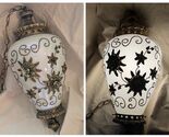 The Cornell Hollywood Regency Gold Decorated Milk Glass Hanging Swag Lamp is a vintage collectible piece with a marbled pattern and multicolor design. This corded electric lamp features a unique combination of materials including bronze, mixed materials, glass, marble, and milk glass, giving it a luxurious and elegant look. Perfect for both men and women, this original Hollywood Regency style lamp adds a touch of glamour to any space with its intricate detailing and timeless design.