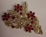 Stunning vintage brooch of textured goldtone leaves adorned with cranberry rhinestone flowers. The camera cannot capture its true color. The piece has a copyright mark, but is an unsigned Coro. Vintage 50s/60s. This very elegant brooch measures 2-3/8" by 1-3/4" and fastens with a 1-1/4" pin bar with working rollover clasp. In excellent vintage condition.