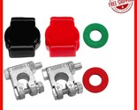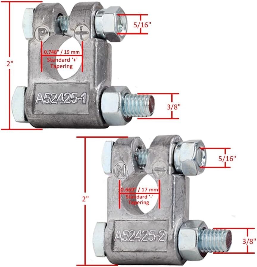 Upgrade your vehicle's power connections with our military-grade lead alloy battery terminal kit. Designed for strength and corrosion resistance, this set includes one positive and one negative terminal, each clearly marked and complemented by durable red and black covers. The terminals feature a standard 3/8" bolt for lugs mounting, plus a 5/16" short bolt for versatility. Capable of accommodating multiple cables, these terminals are compatible with cars, RVs, boats, and other vehicles with standard top post batteries (19 mm positive, 17 mm negative). The complete kit offers all essentials: positive and negative terminals along with terminal covers, ensuring reliable and durable connections for your power needs.