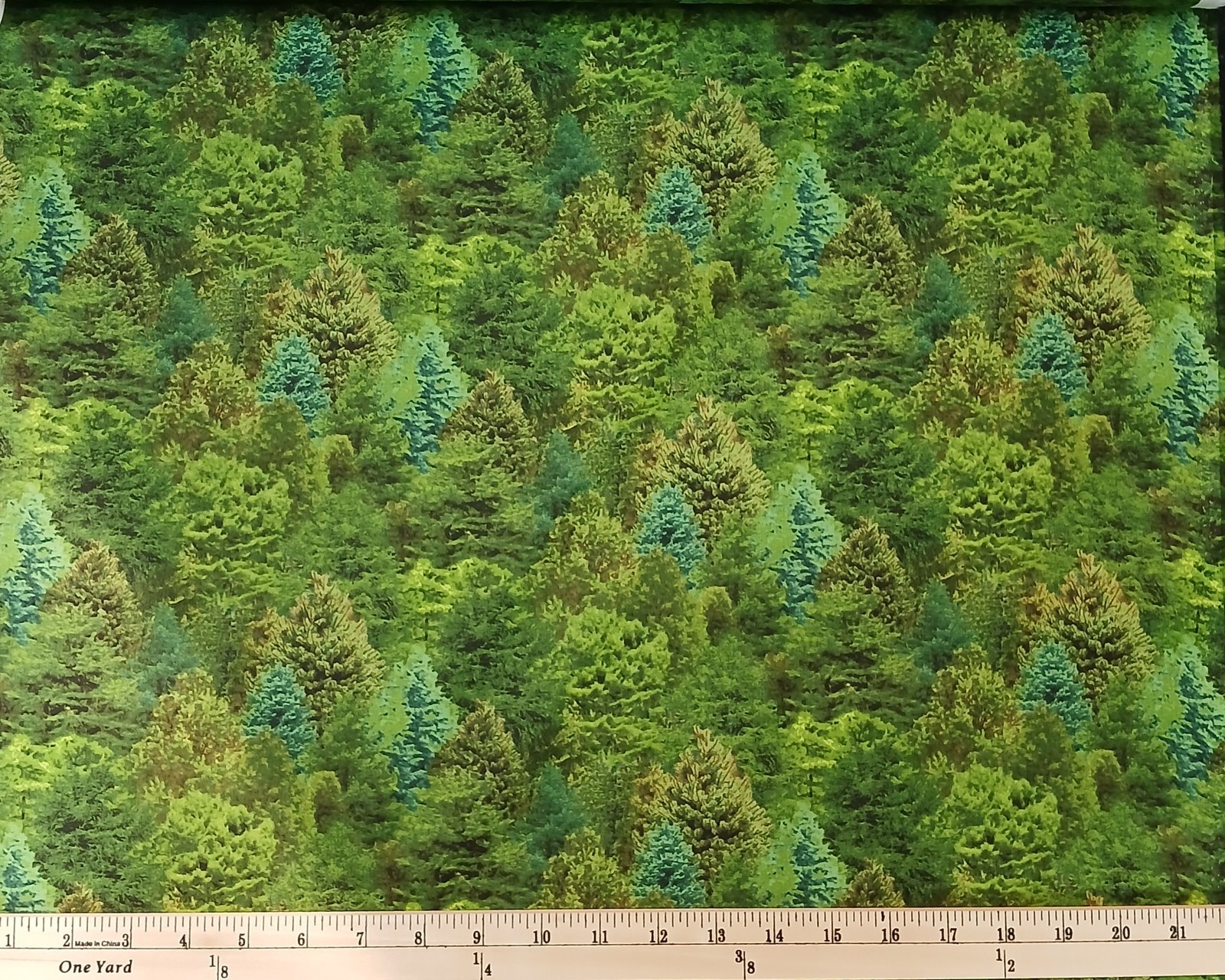 Cotton Landscape Medley Trees Pine Fir Nature Serene Woods Elizabeth Studios Cotton Fabric Print by the Yard (176GREEN) Cotton Fabric Print - 44" Wide - Sold by the Yard 100% Cotton Multiple yards are one continuous cut. Not intended for use in childrens sleepwear.